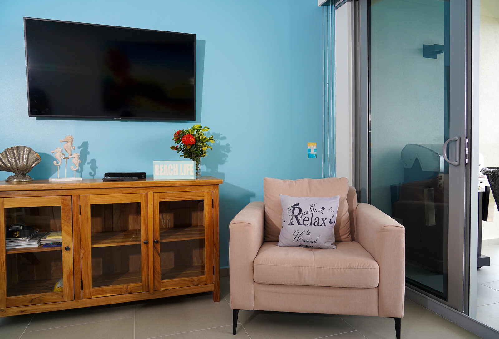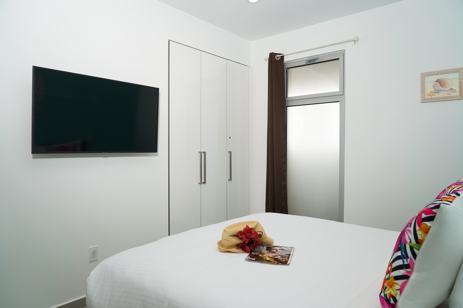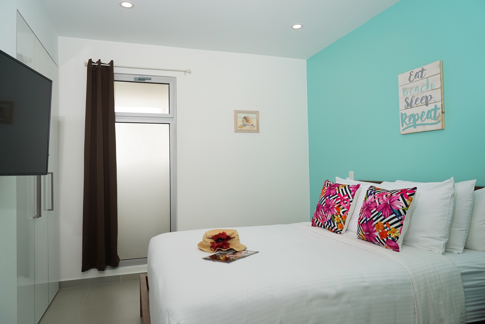 This air-conditioned one-bedroom suite features one queen bed, one bathroom with shower, hairdryer, and a fully equipped kitchen, everything for basics cooking is in here. Dining/living area has the perfect combination for a view: the beautiful common areas of the complex and the Caribbean in the back. Also, a sofa bed which unfolds to a full-size bed is available in this unit. Washer and dryer in the unit. One step into the balcony through sliding doors and let’s drink a couple of wine enjoying the view, magnificent. Free Wi-Fi and TV in living room and bedroom.