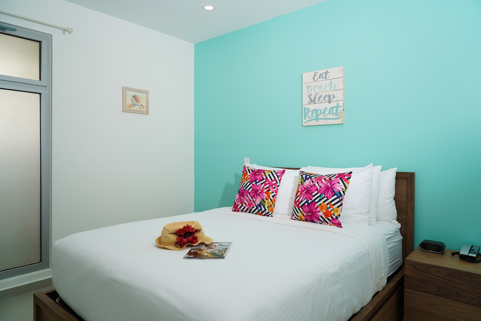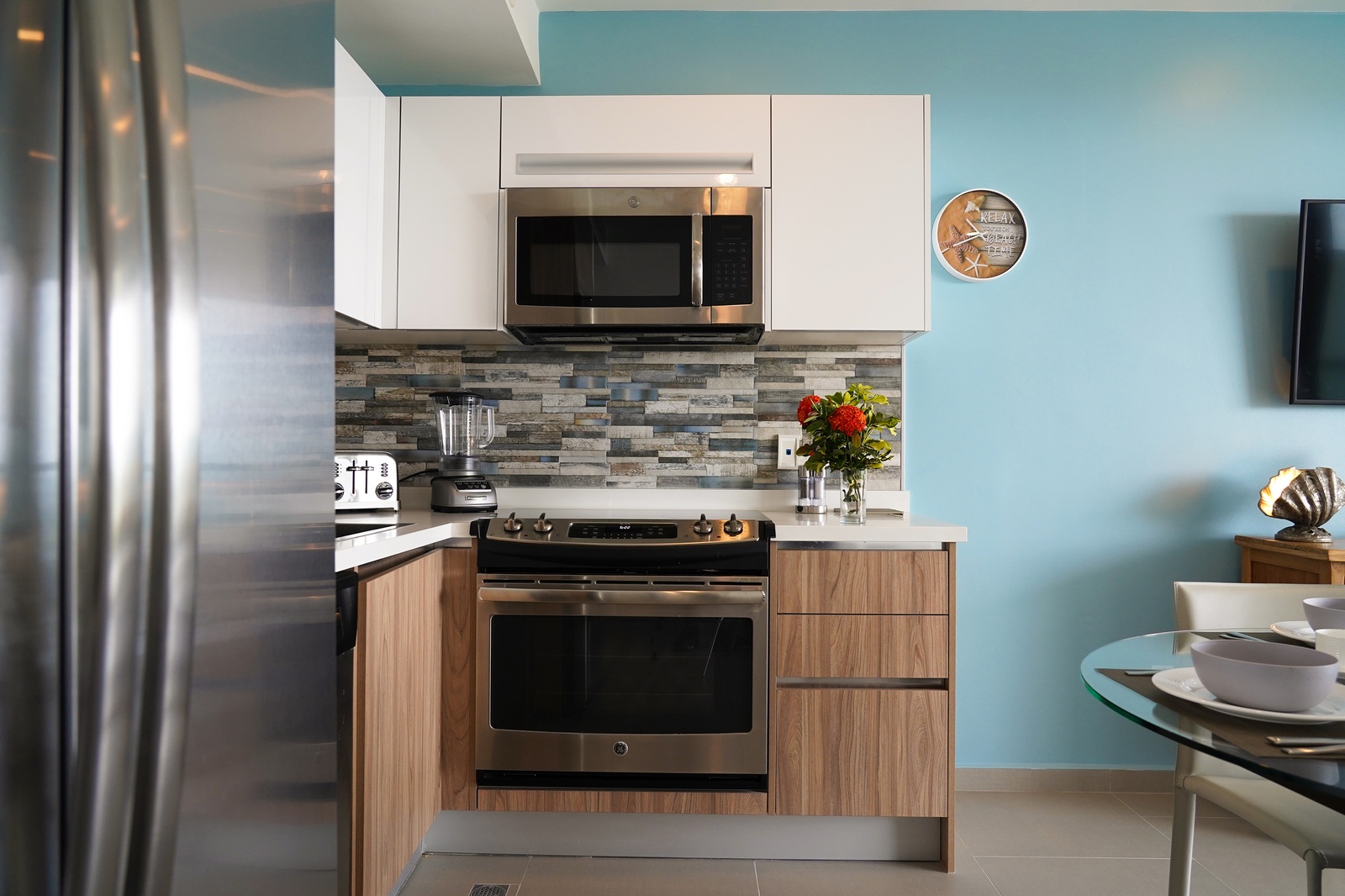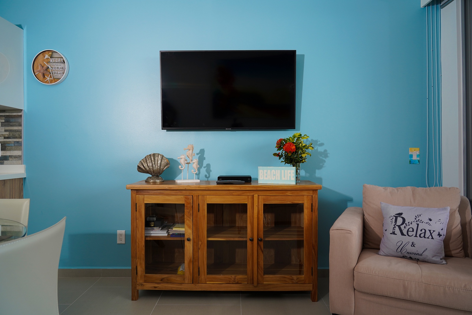 This air-conditioned one-bedroom suite features one queen bed, one bathroom with shower, hairdryer, and a fully equipped kitchen, everything for basics cooking is in here. Dining/living area has the perfect combination for a view: the beautiful common areas of the complex and the Caribbean in the back. Also, a sofa bed which unfolds to a full-size bed is available in this unit. Washer and dryer in the unit. One step into the balcony through sliding doors and let’s drink a couple of wine enjoying the view, magnificent. Free Wi-Fi and TV in living room and bedroom.