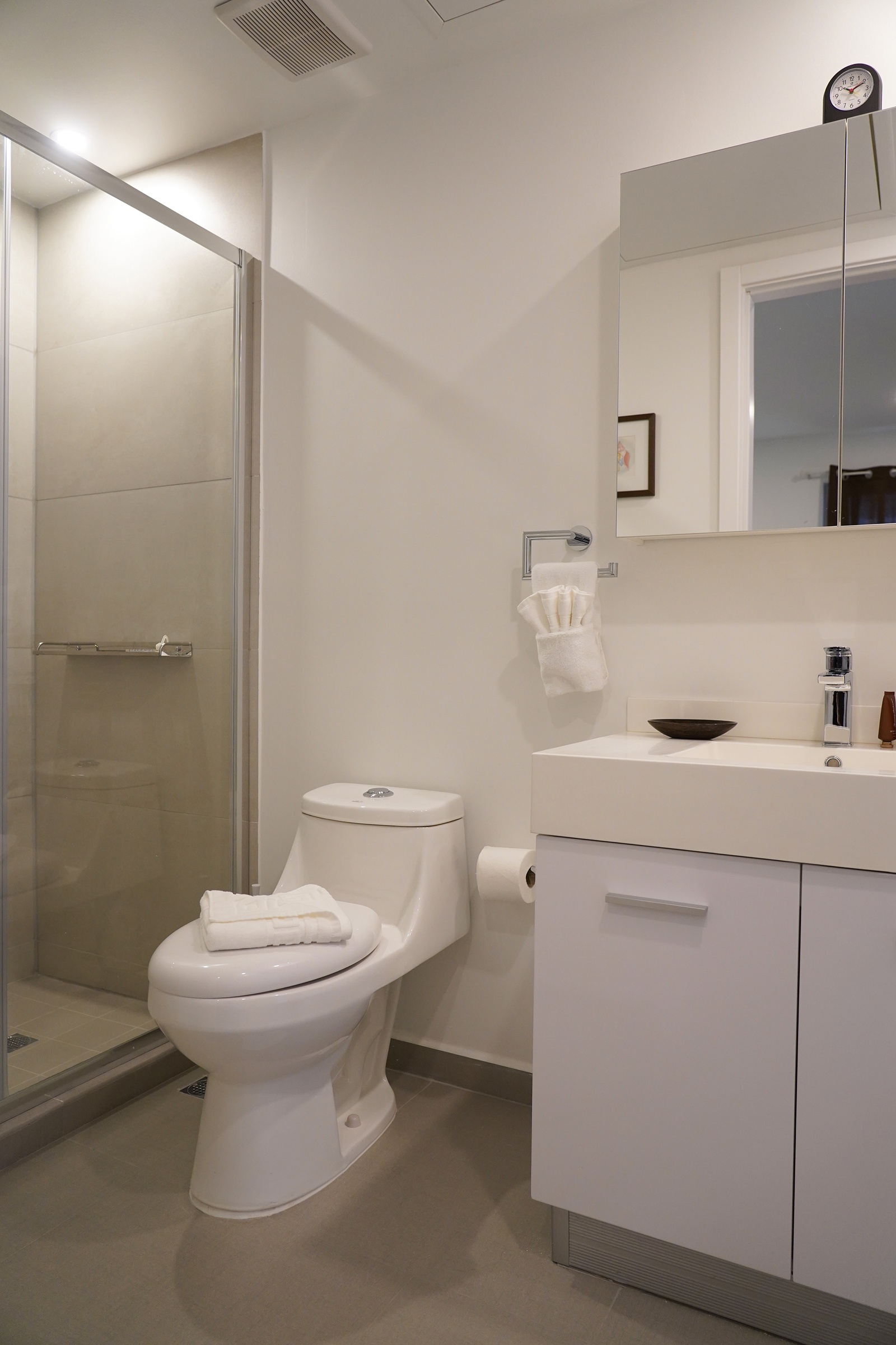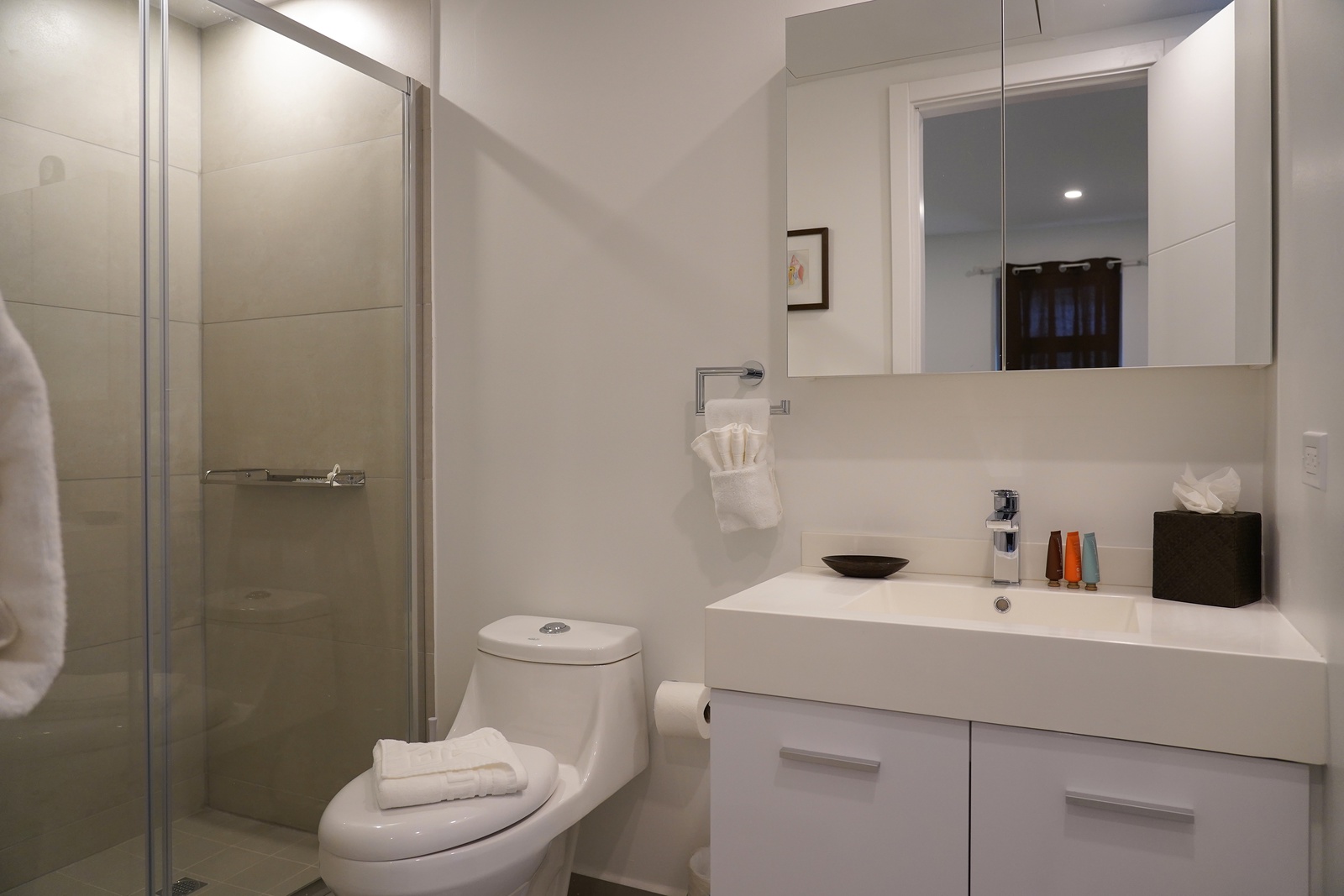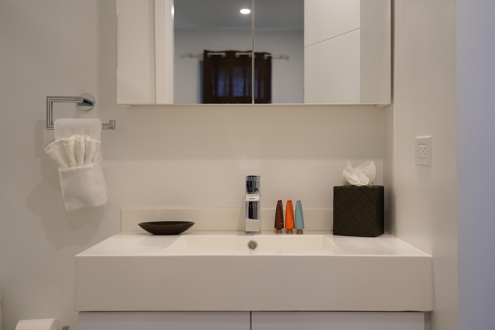 • Bathroom has their own white towels and blue beach towels in the vanity.