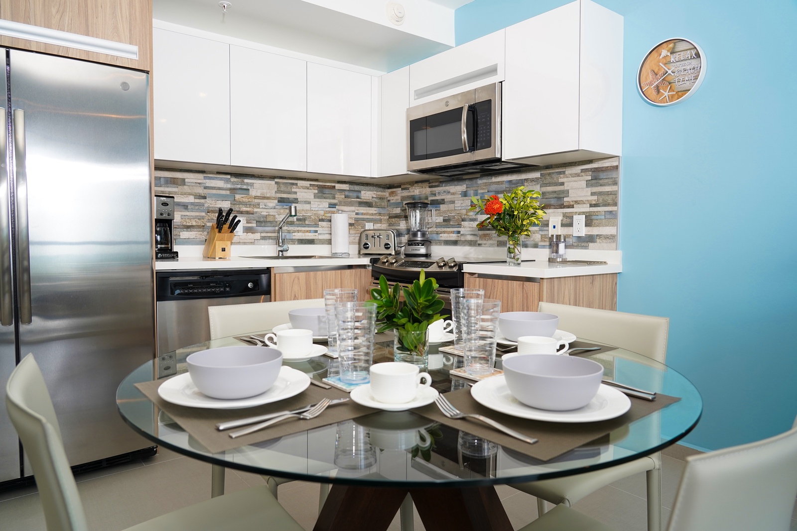 • An infinity pool and tropical deck create a relaxing environment at the center of the complex with poolside lounges and umbrellas from 8:00 am to 8:00 pm.