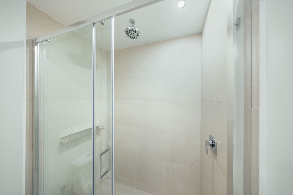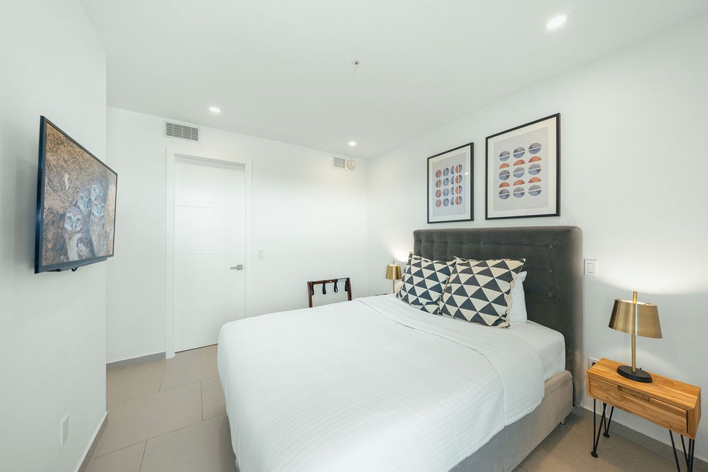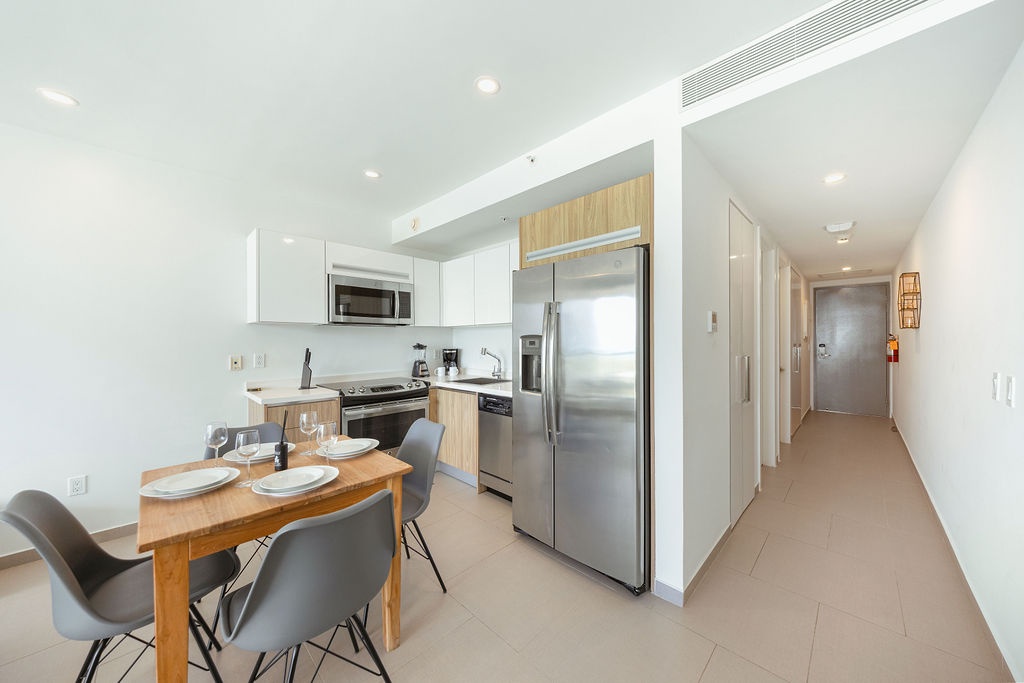 The well-appointed bedroom boasts a plush queen-sized bed, ensuring a restful night's sleep, and the modern bathroom is equipped with a walk-in shower and all necessary amenities. The fully-equipped kitchen includes a refrigerator, stove, microwave, and all the essentials you need to prepare delicious meals.