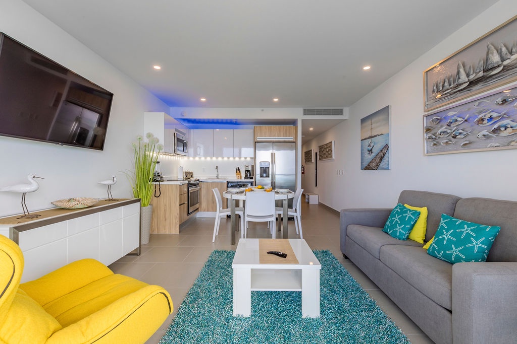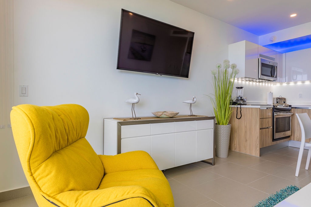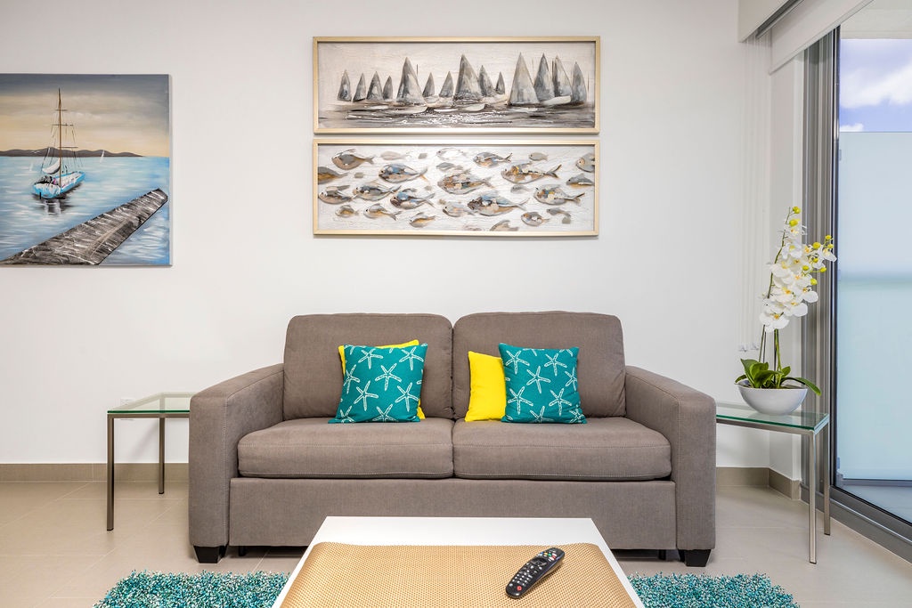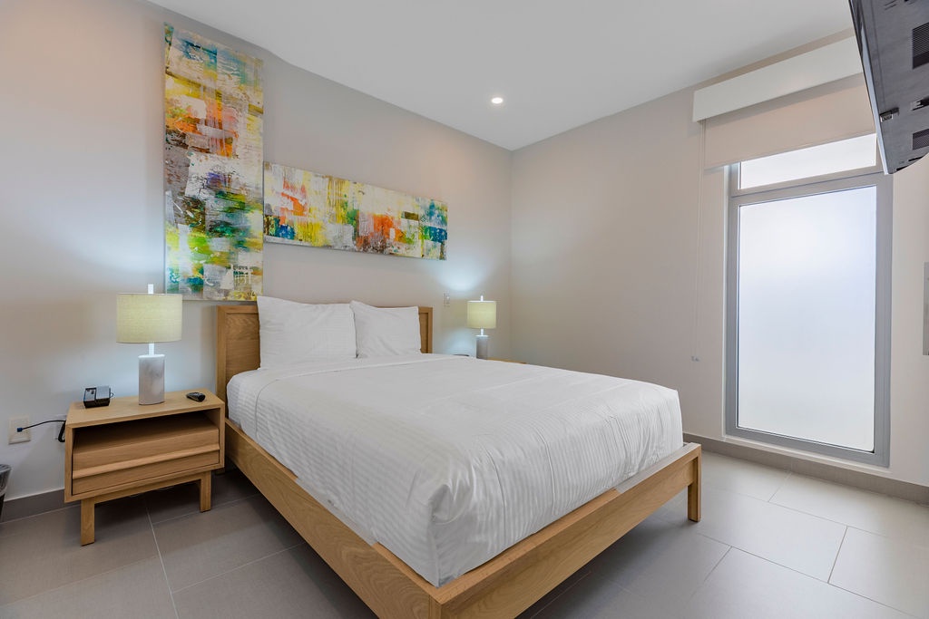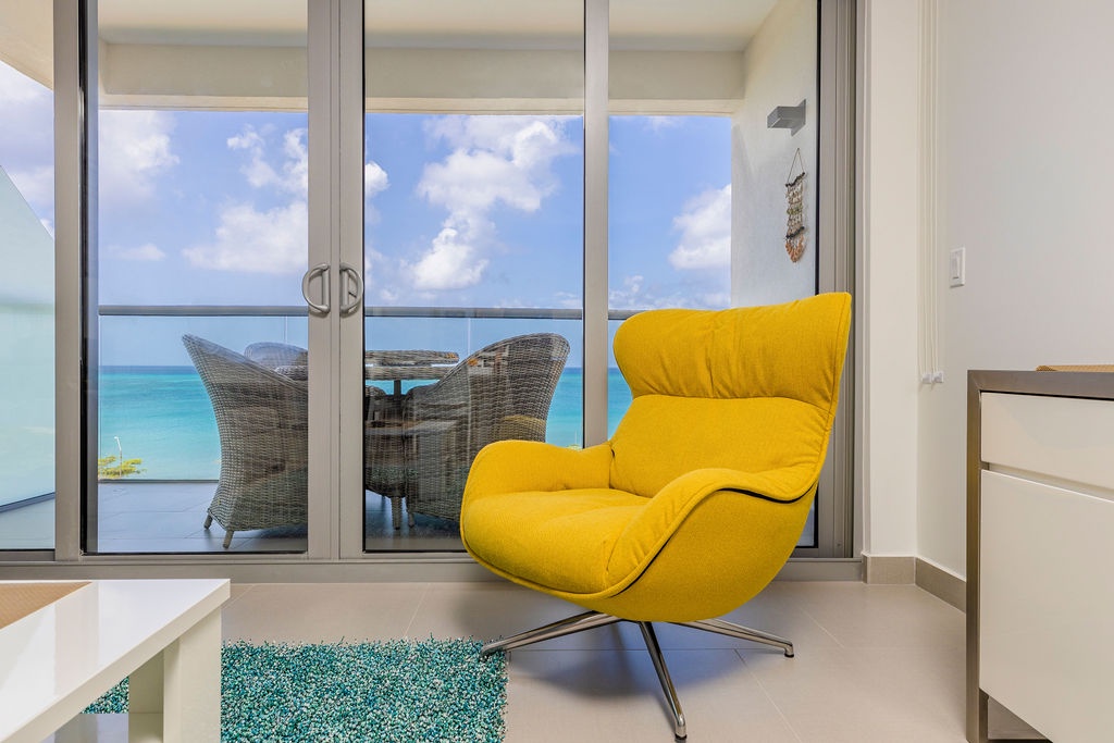 This air-conditioned one-bedroom suite features one king bed, one bathroom with shower, hairdryer, and a fully equipped kitchen, everything for basics cooking is in here. Dining/living area has the perfect combination for a view: the beautiful common areas of the complex and the Caribbean in the back. Washer and dryer in the unit. One step into the balcony through sliding doors and let’s drink a couple of wine enjoying the view, magnificent. Free Wi-Fi and TV in living room and bedroom.