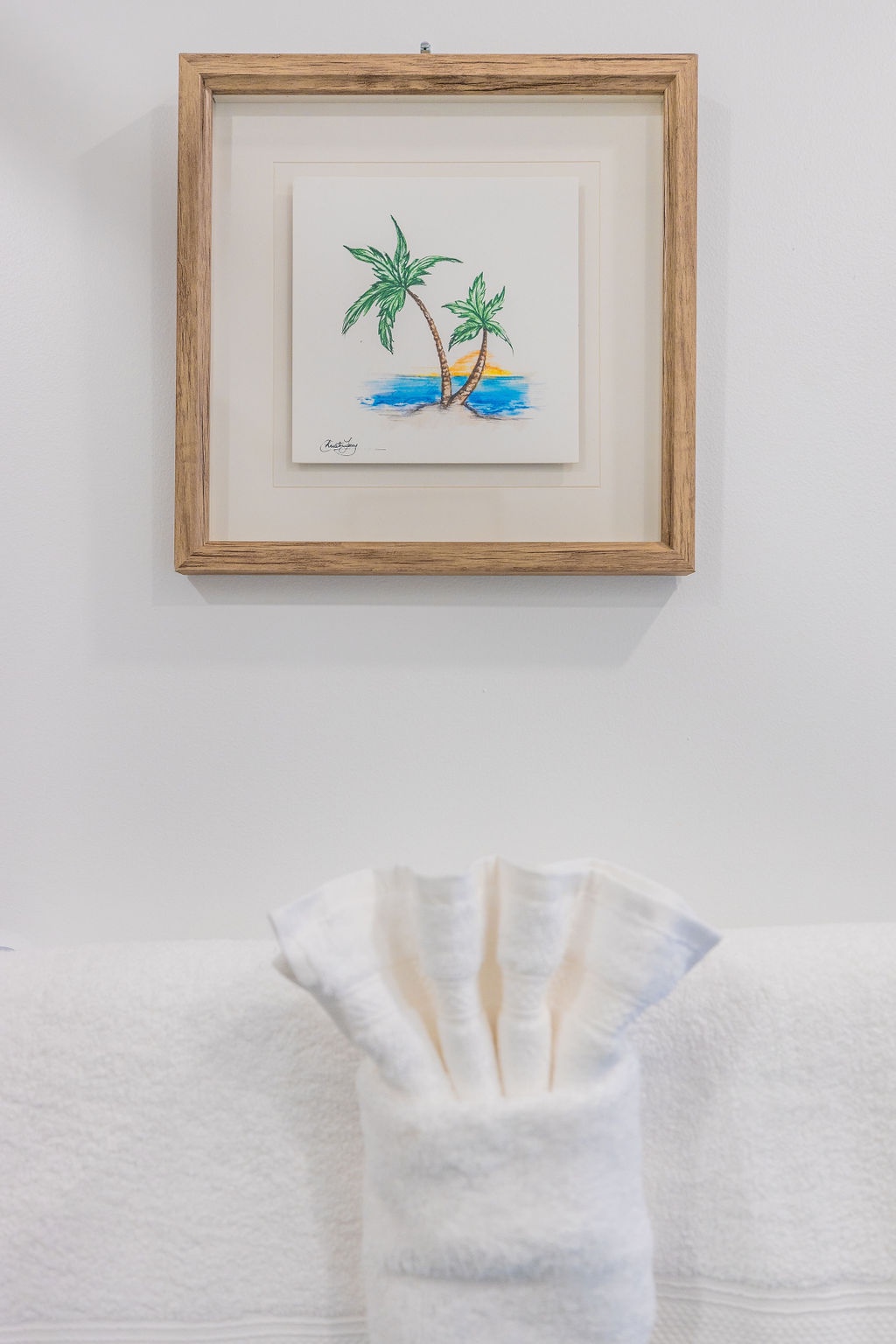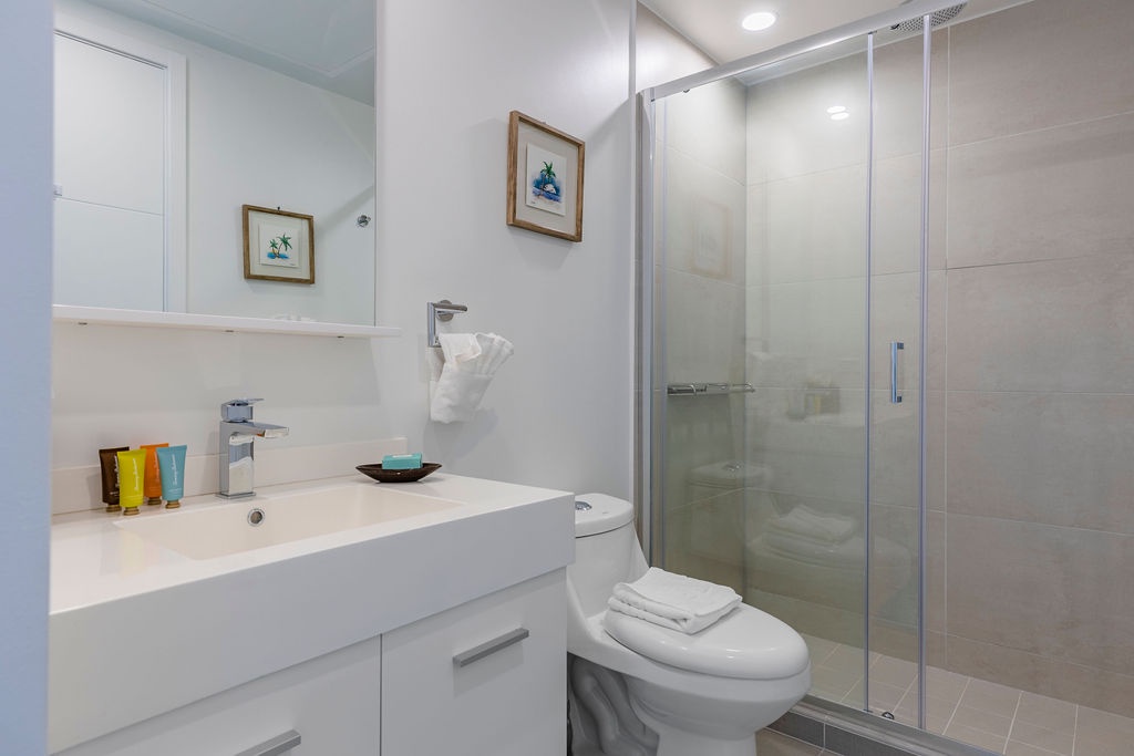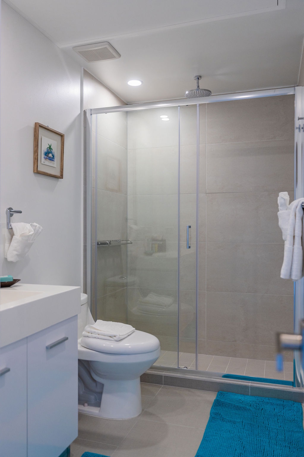 • Each bathroom has their own white towels and blue beach towels in the vanity.