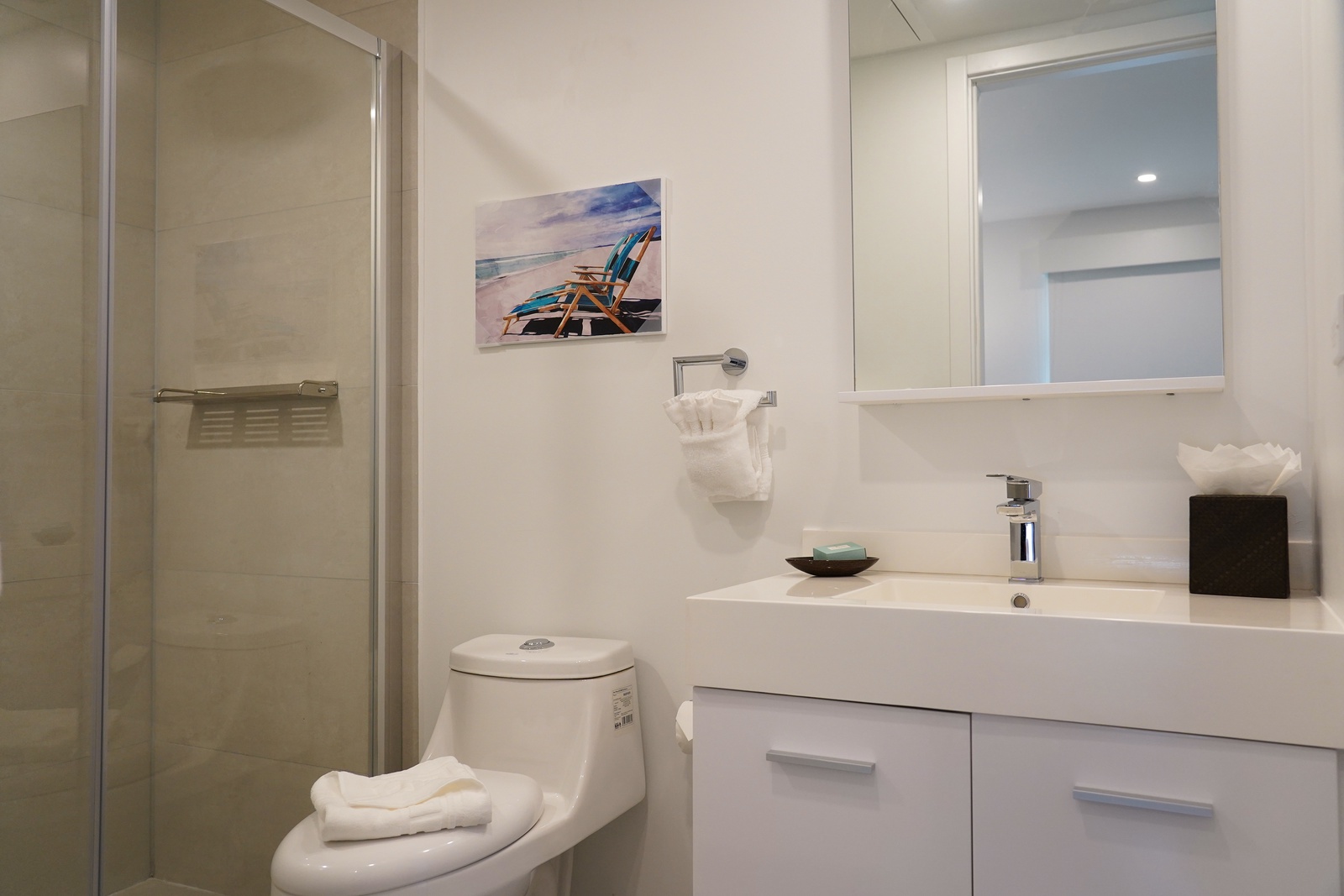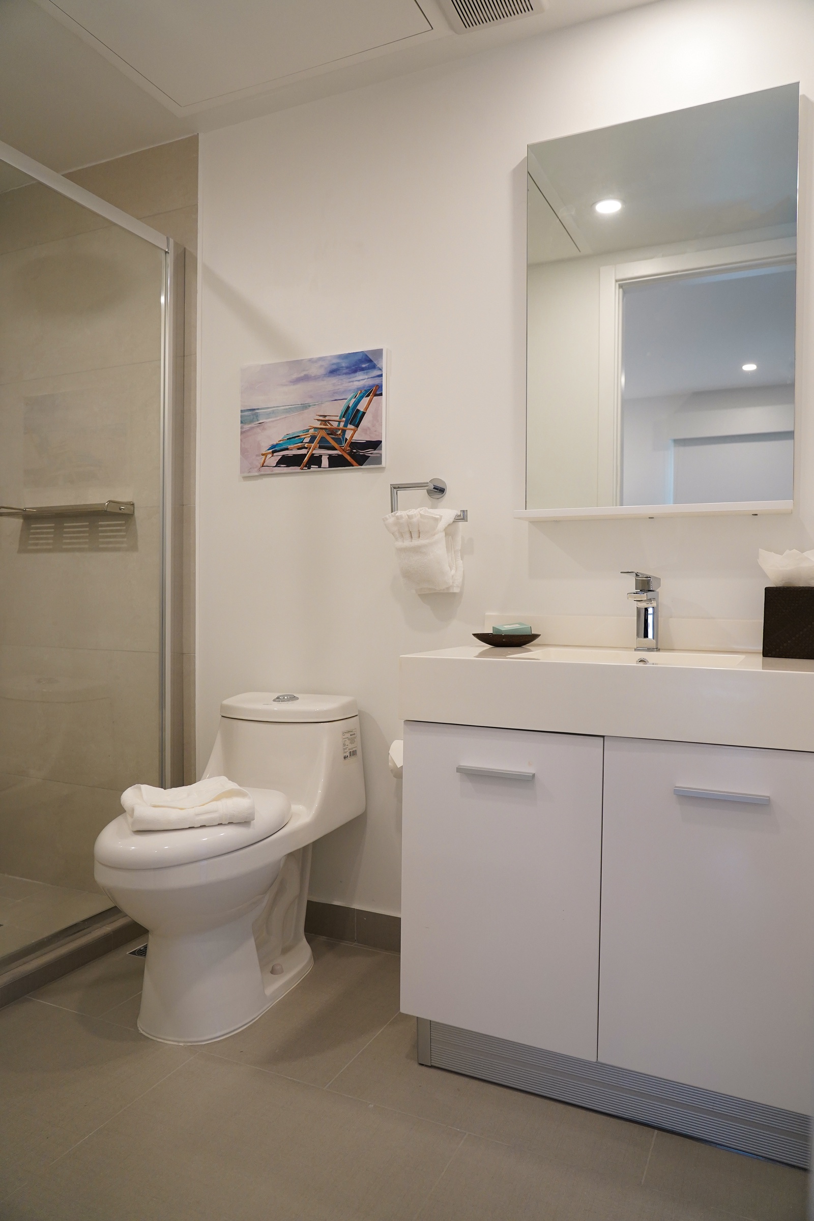 • Bathroom has their own white towels and blue beach towels in the vanity.