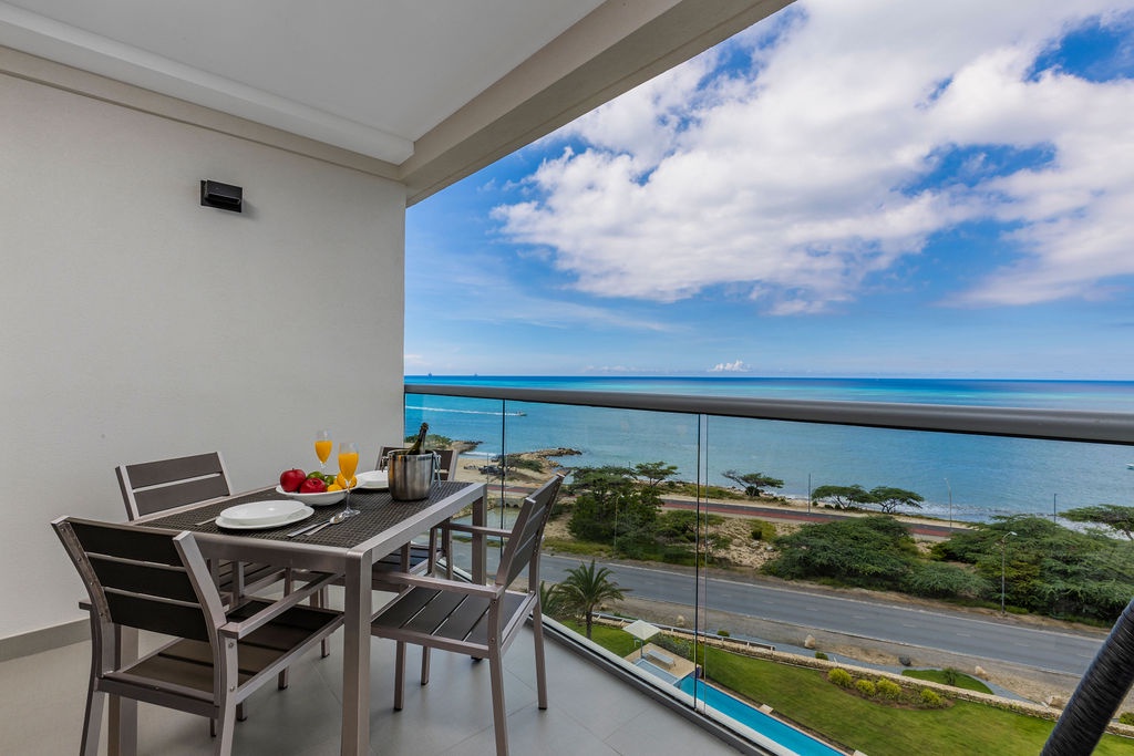 This air-conditioned one-bedroom suite features one king bed, one bathroom with shower, hairdryer, and a fully equipped kitchen, everything for basics cooking is in here. Dining/living area has the perfect combination for a view: the beautiful common areas of the complex and the Caribbean in the back. Also, a sofa bed which unfolds to a full-size bed is available in this unit. Washer and dryer in the unit. One step into the balcony through sliding doors and let’s drink a couple of wine enjoying the view, magnificent. Free Wi-Fi and TV in living room and bedroom.