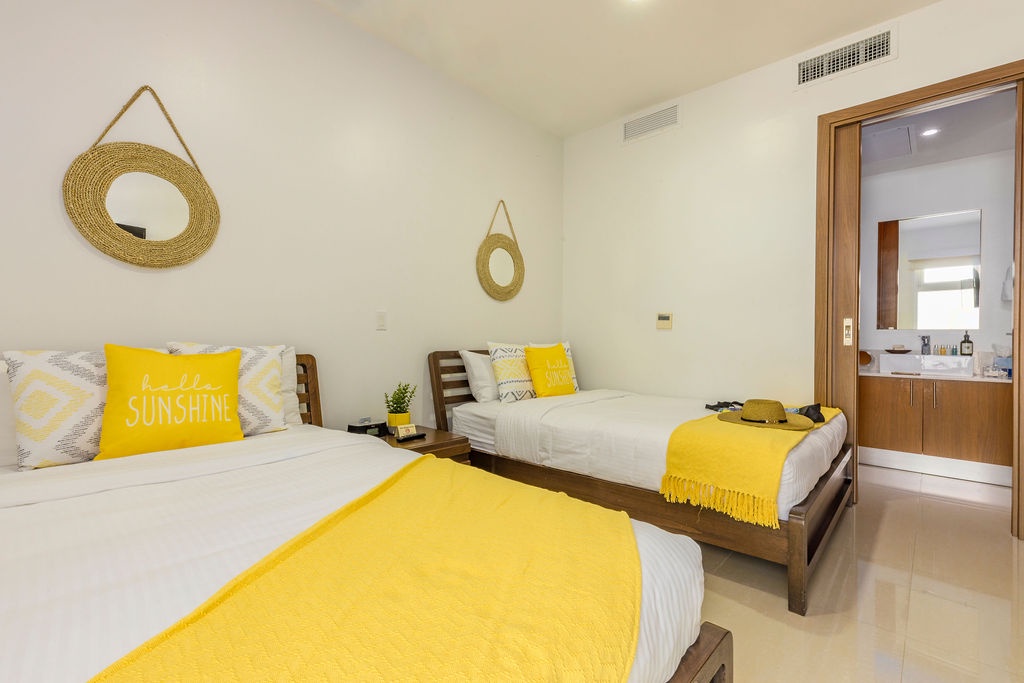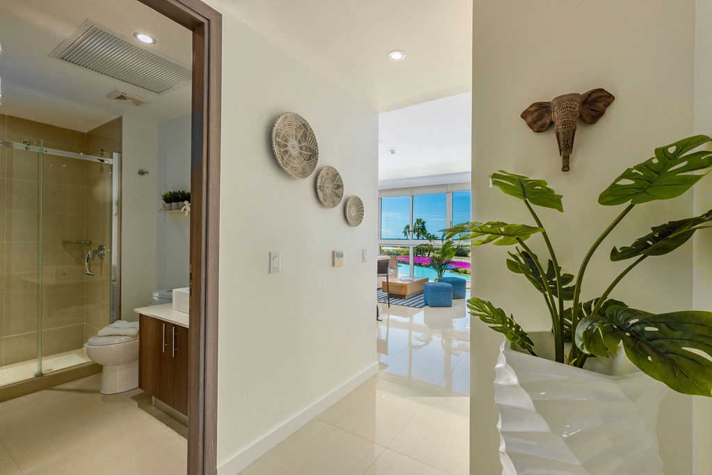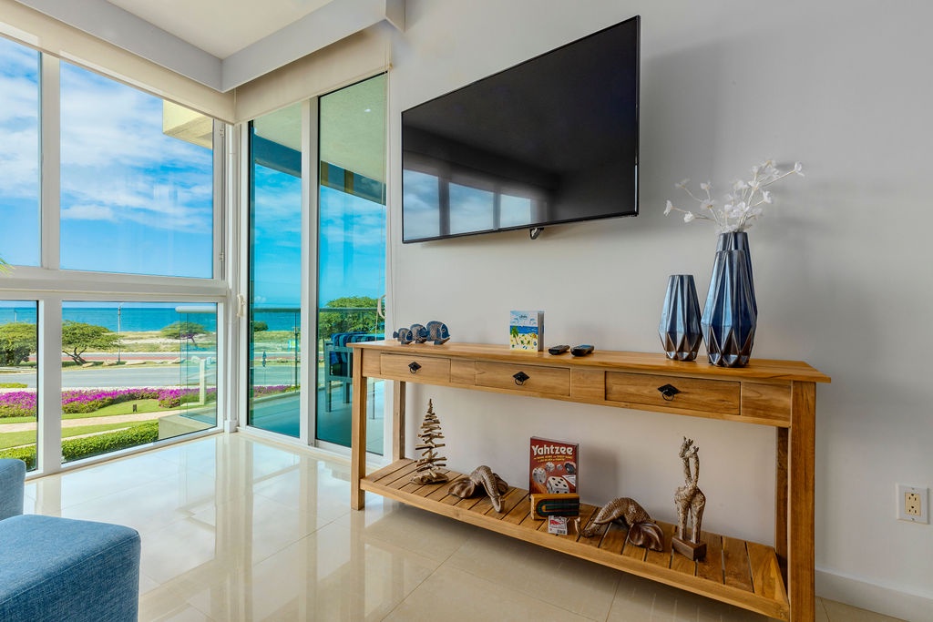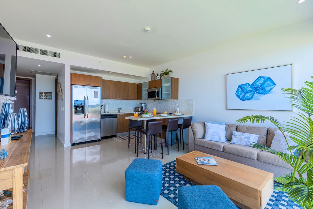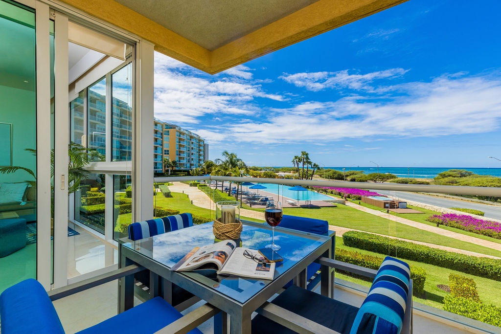 This air-conditioned apartment features one bedroom and one bathroom. The bedroom with 2 Full-size bed, a full bathroom. Don't miss the opportunity to enjoy the lovely breeze in the balcony. Open living/dining space looking over the pools and gardens with the ocean at the back, and a fully equipped kitchen. Washer and dryer, and Free Wi-Fi and TV’s in all rooms.