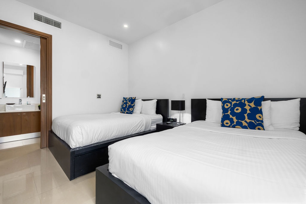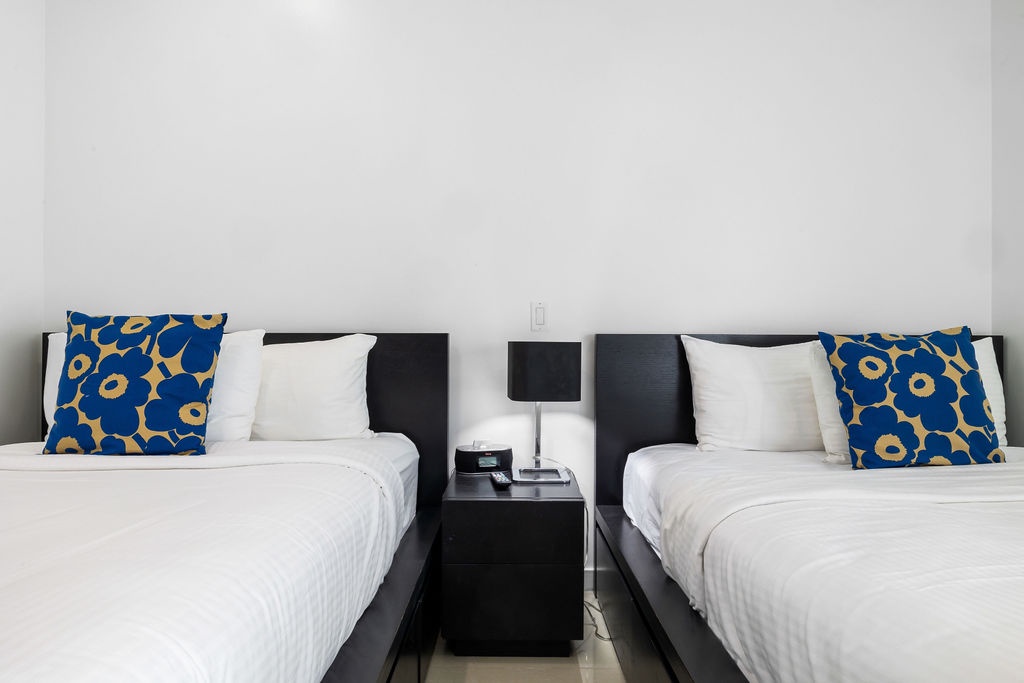 This air-conditioned one-bedroom suite has a relaxing ocean view. Featuring two full beds in the and a full bathroom, fully equipped kitchen, dining and living area with sofa bed which unfolds to a full-size bed, washer and dryer. One step into the balcony through sliding doors as you gaze out at the ocean. Free Wi-Fi and TV’s in all rooms.