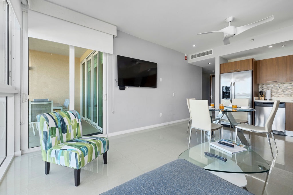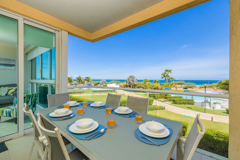 This air-conditioned apartment is perfect for you to relax and spend the best vacation with family and friends. Featuring two full beds, one bathroom with shower, fully equipped kitchen, dining and living area with sofa bed which unfolds to a full-size bed, washer and dryer. One step onto the balcony through sliding doors as you gaze out at the ocean. Free Wi-Fi and TV’s in all rooms.