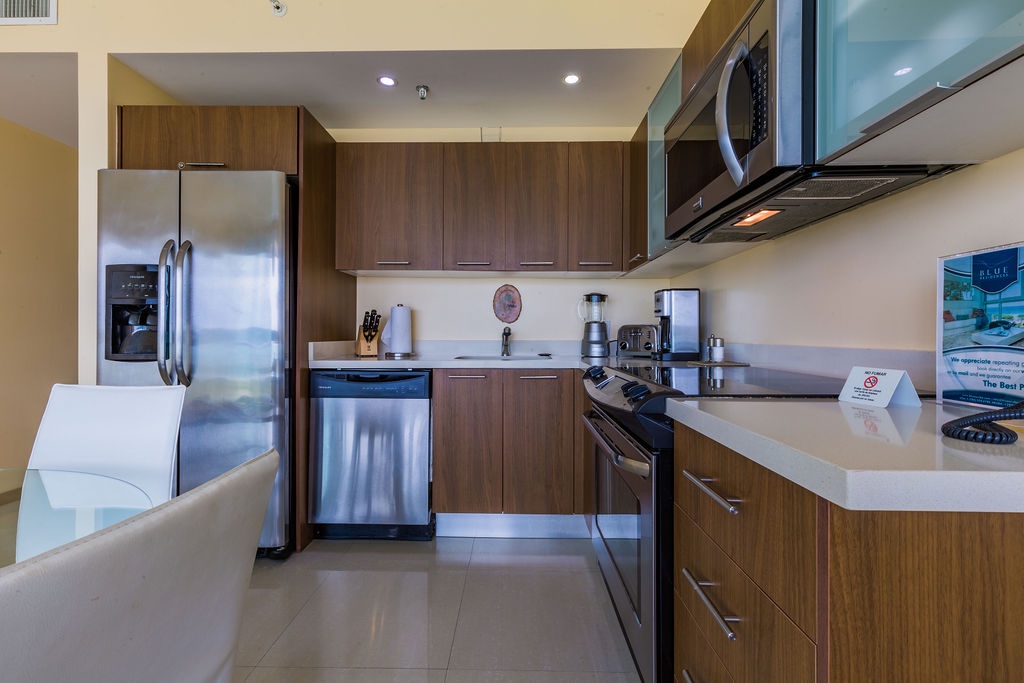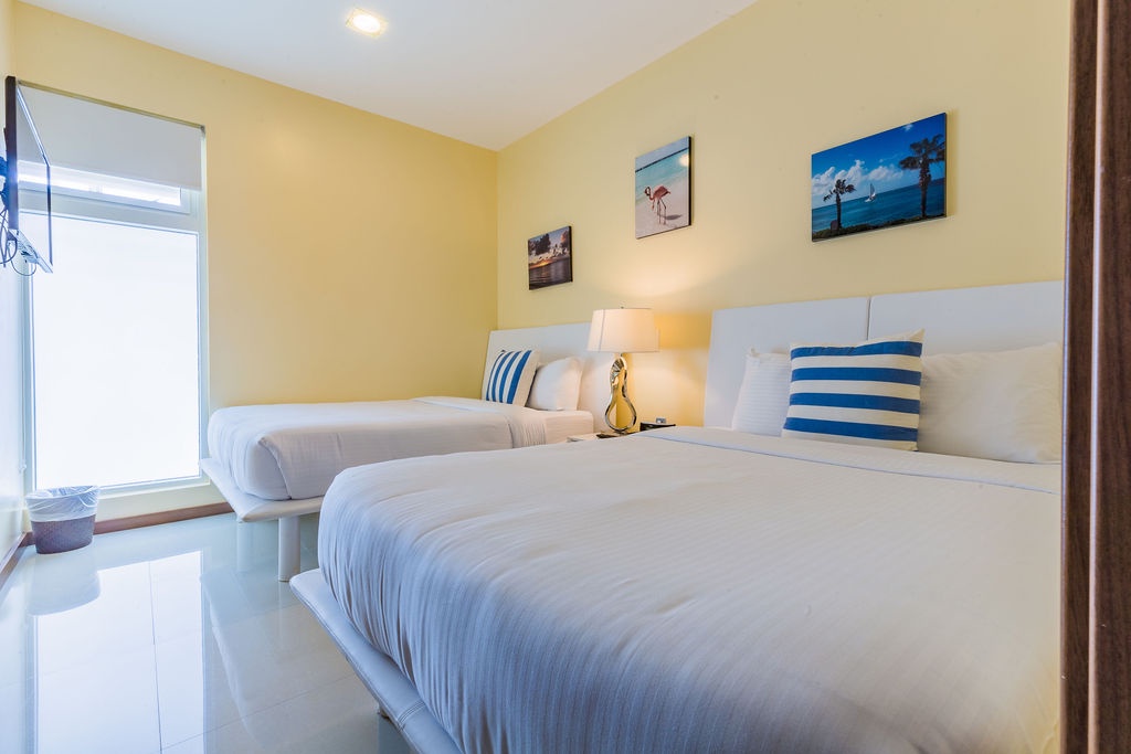 This air-conditioned one-bedroom suite has a spectacular ocean view. Featuring two full beds, one full bathroom with hairdryer, full equipped kitchen, dining and living area with sofa sleeper which unfolds to a full-size beds, washer and dryer. One step onto the balcony through sliding doors as you gaze out at the ocean. Free Wi-Fi and TV’s in all rooms.