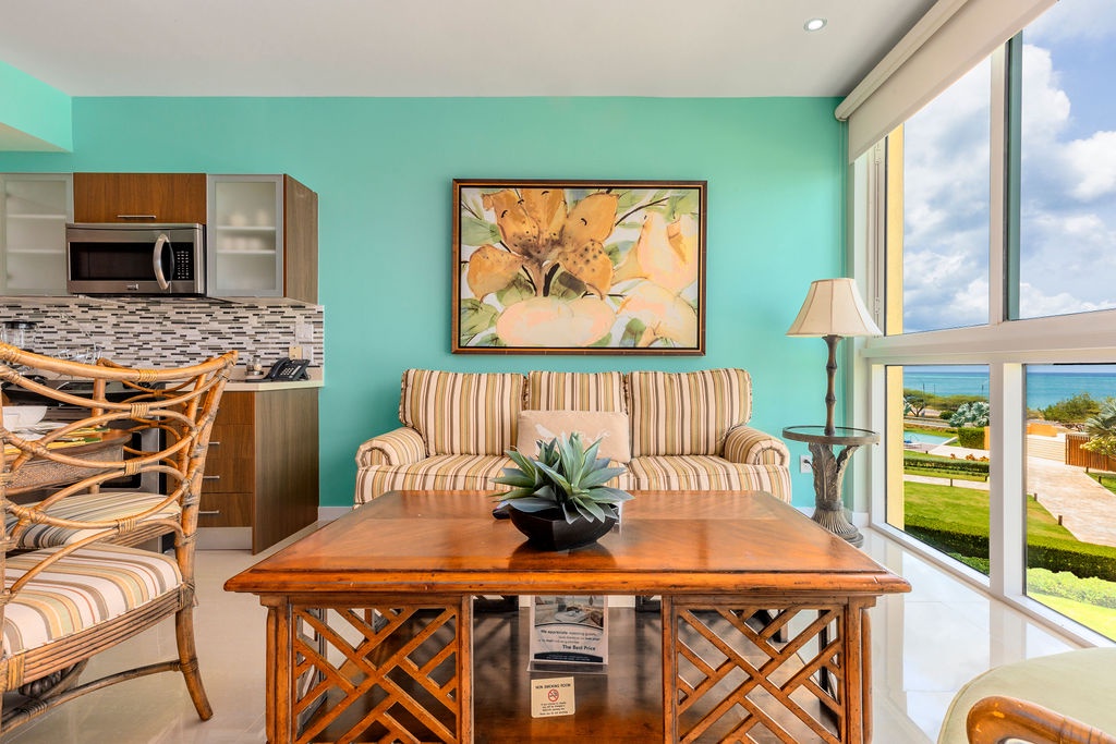 This air-conditioned one-bedroom suite has an ocean view. Featuring two full beds, one bathroom with shower, fully equipped kitchen, dining and living area with sofa bed which unfolds to a full-size bed, washer and dryer. One step into the balcony through sliding doors as you gaze out at the ocean. Free Wi-Fi and TV’s in all rooms.