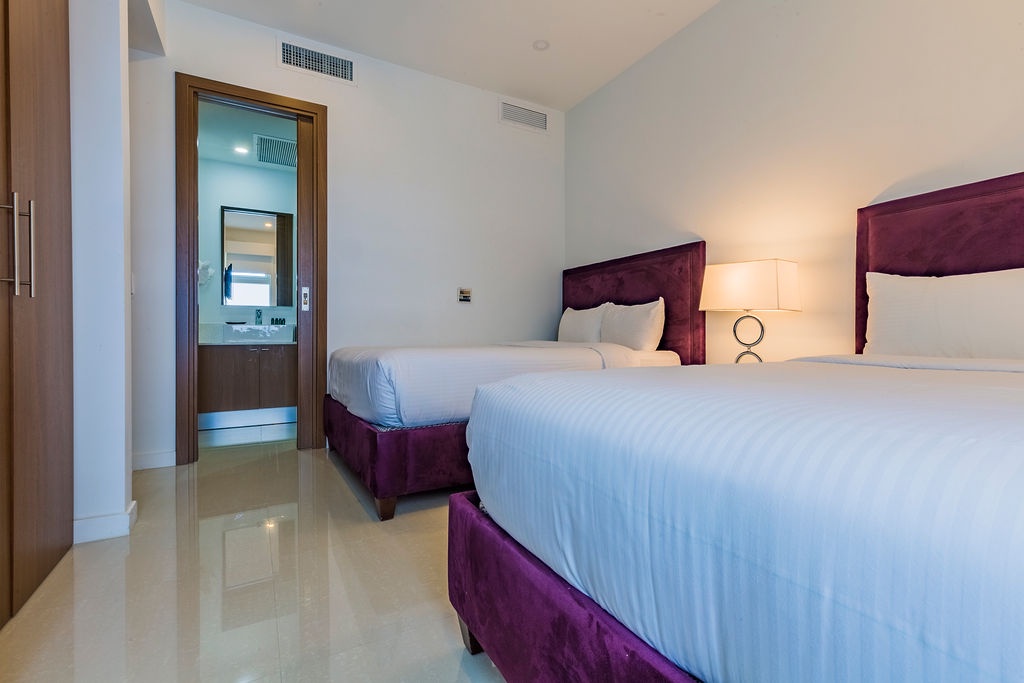 This air-conditioned one-bedroom suite has a spectacular ocean view. Featuring two modern purple full-size beds, one bathroom with shower, fully equipped kitchen, dining and living area with sofa bed which unfolds to a full-size bed, washer and dryer. One step into the balcony through sliding doors as you gaze out at the ocean. Free Wi-Fi and TV’s in all rooms.