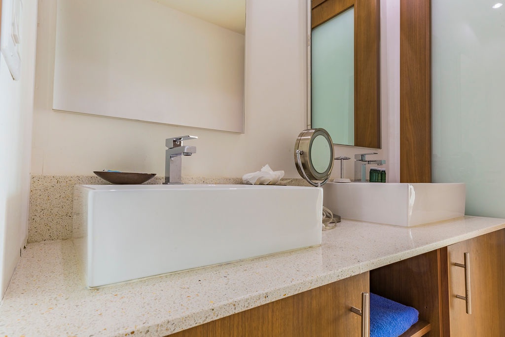 • Each bathroom has their own white towels and blue beach towels in the vanity.