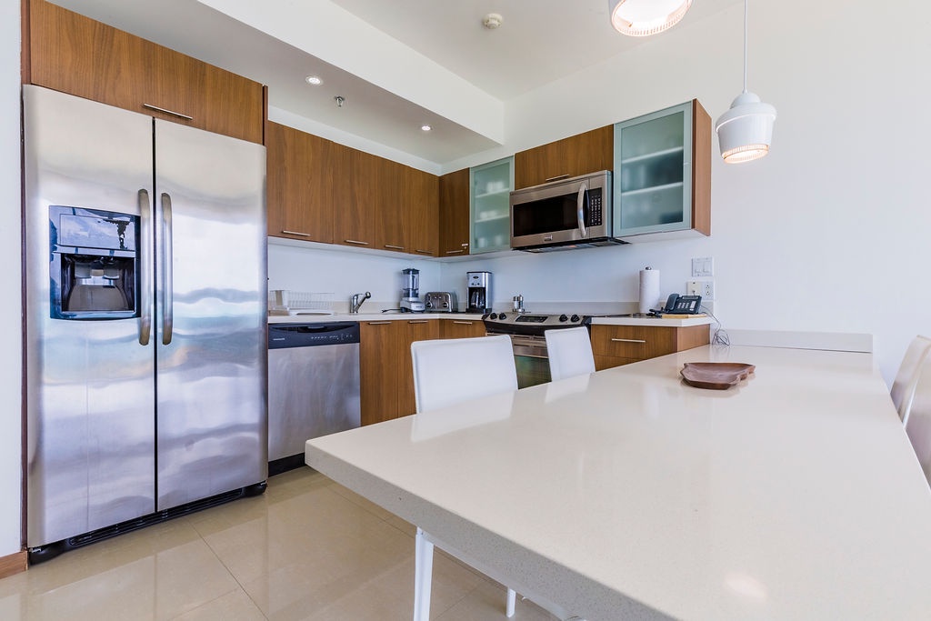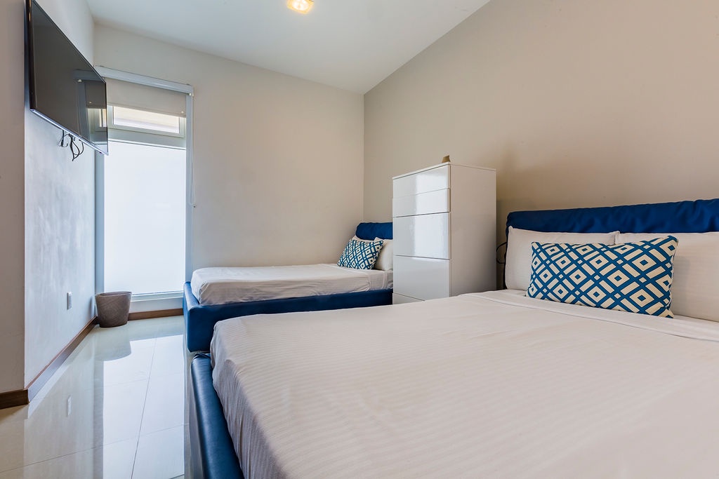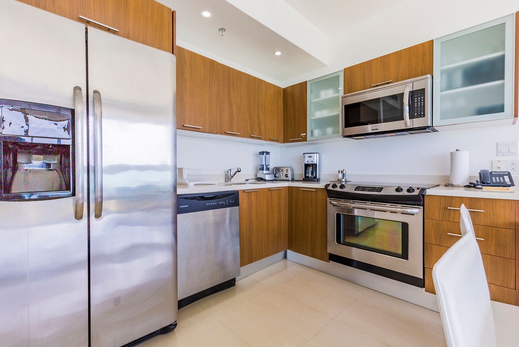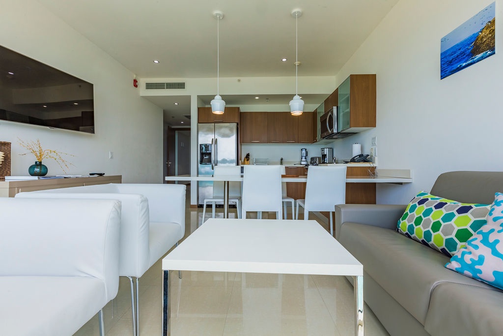 This air-conditioned one-bedroom suite has a spectacular ocean view. Featuring two full beds, one bathroom with shower, fully equipped kitchen, dining and living area with sofabed which unfolds to a full-size bed, washer and dryer. One step onto the balcony through sliding doors as you gaze out at the ocean. Free Wi-Fi and TV’s in all rooms.