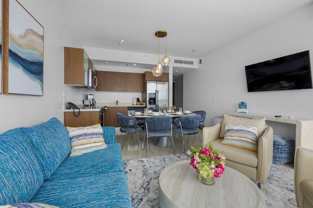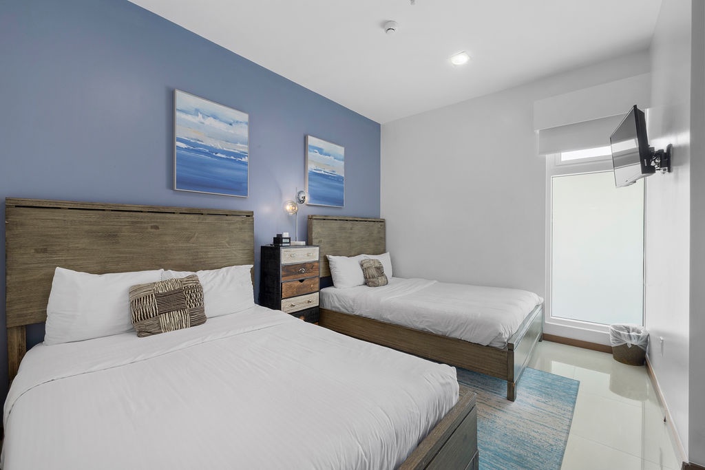 This air-conditioned one-bedroom suite has a spectacular ocean view. Featuring two full beds, one full bathroom with hairdryer, a fully equipped kitchen, dining and living area with sofa bed which unfolds to a full-size bed, and a washer and dryer. One step onto the balcony through sliding doors as you gaze out at the sea. Free Wi-Fi and TV’s in all rooms.