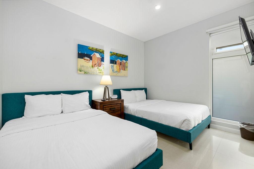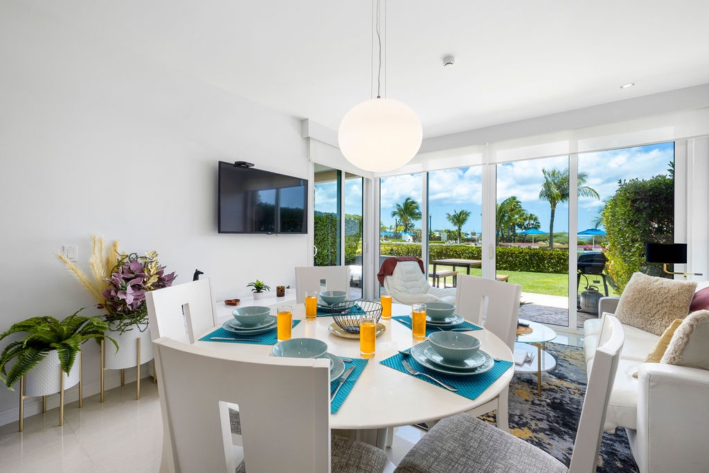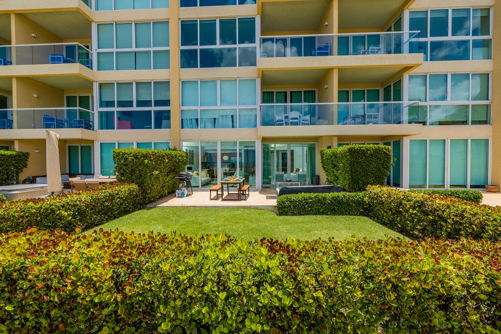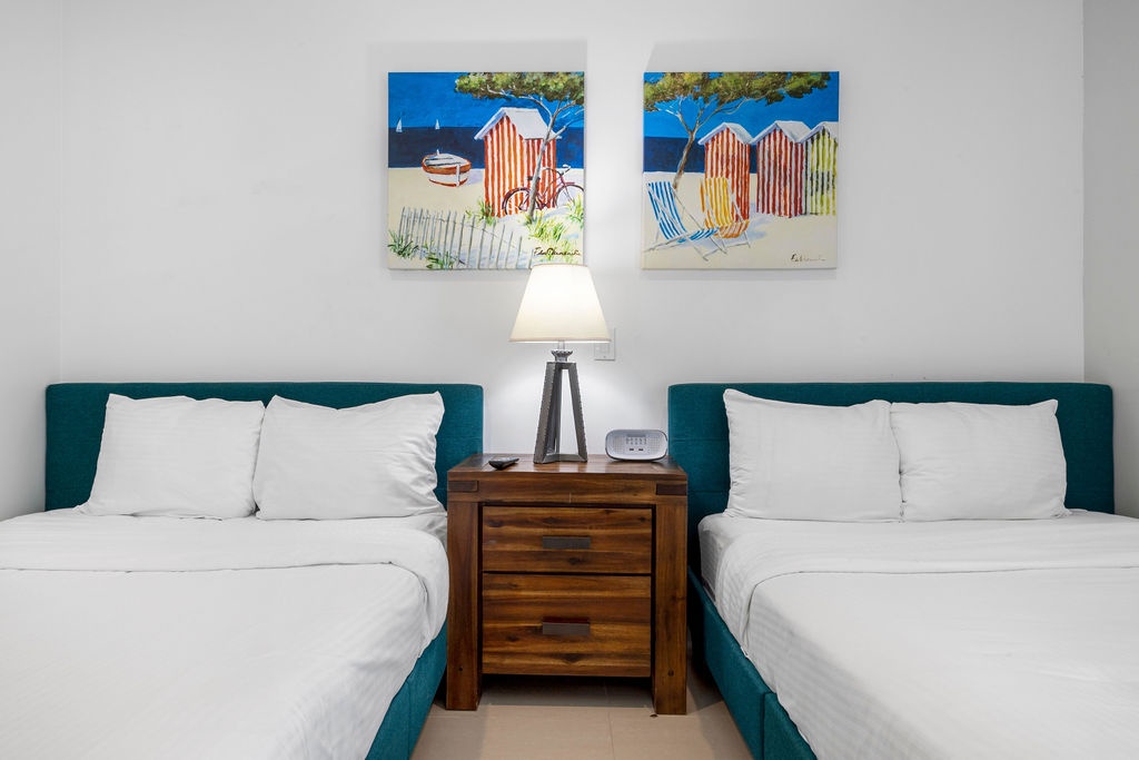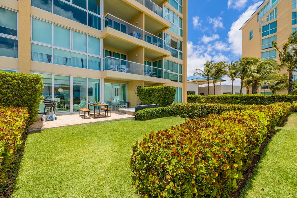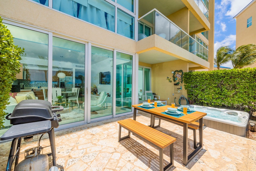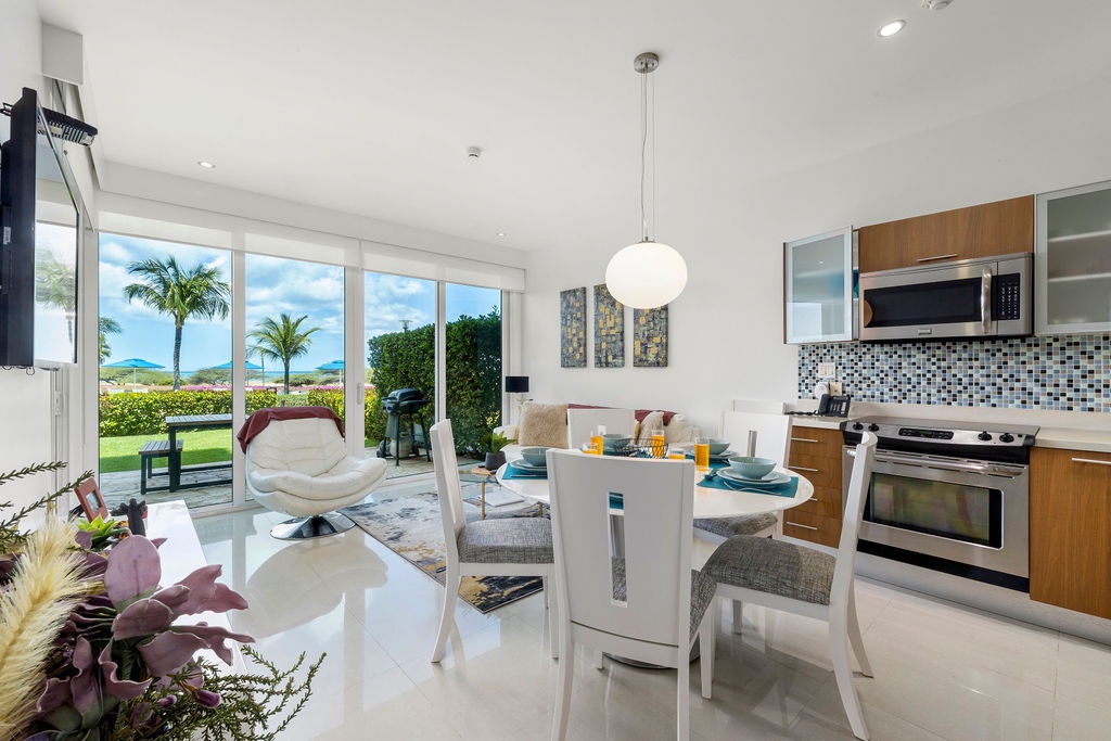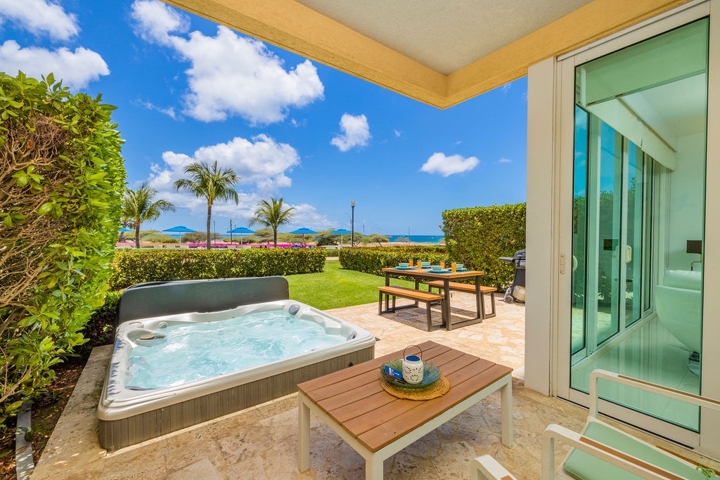 The air-conditioned one-bedroom apartment features master bedroom with two turquoise beautiful double beds and a full bathroom. However, the best feature will be to be outside with the Caribbean breeze in your private patio looking at the ocean and the bubbly Jacuzzi. What not to love from this condo: private patio, own Jacuzzi, ocean view, pools right there, just a few steps away, and cozy air-conditioned unit.
