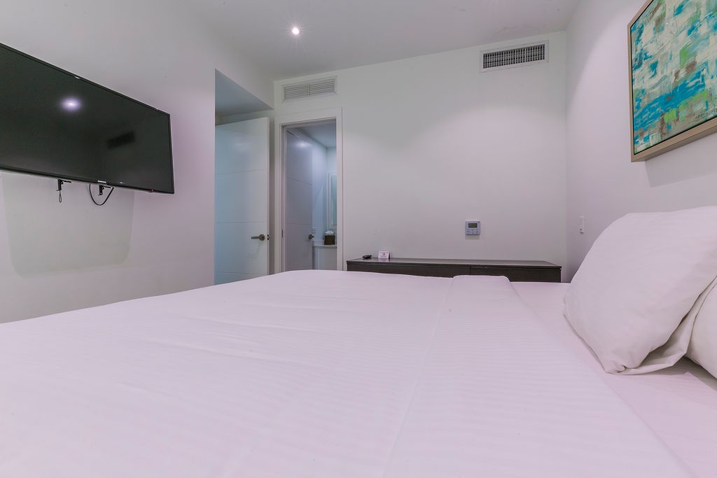A full- air-conditioned one-bedroom apartment set up with a Queen Bed and full bathroom. Fully equipped kitchen. Living/Dining room with sofa bed which unfolds into a full-size bed. TV’s and Wi-Fi, Washer & Dryer, Iron & Ironing Board.