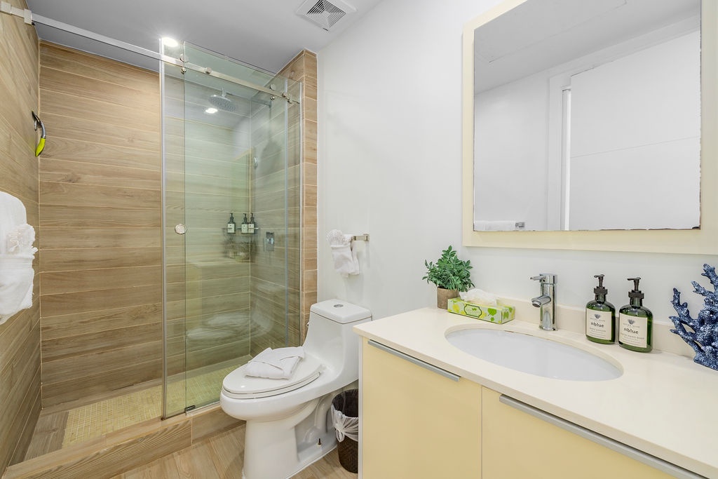 • Each bathroom has their own white towels and blue beach towels in the vanity.