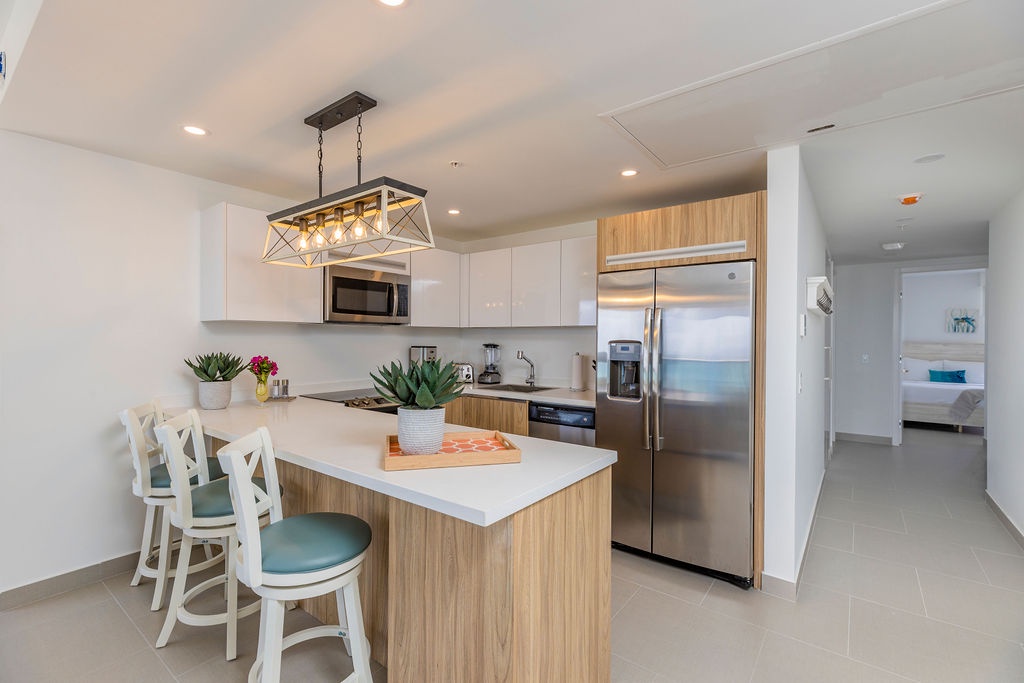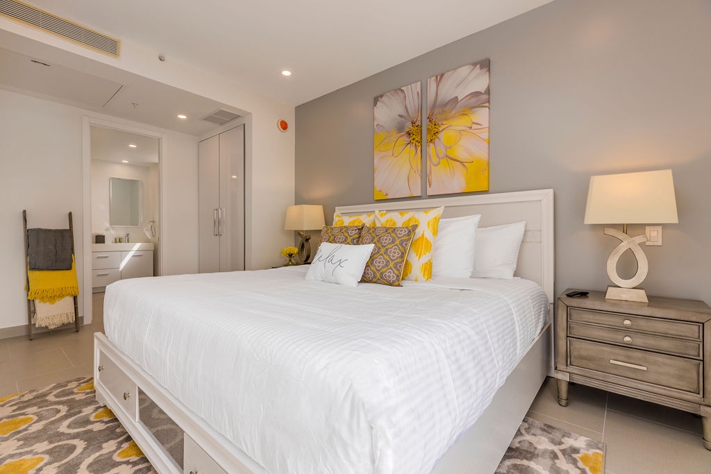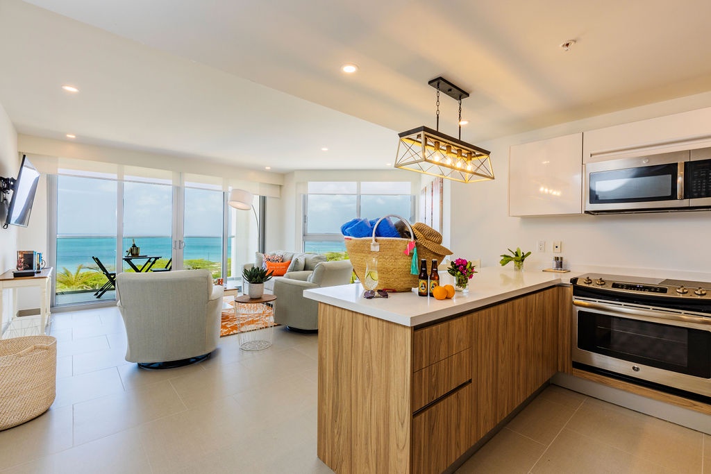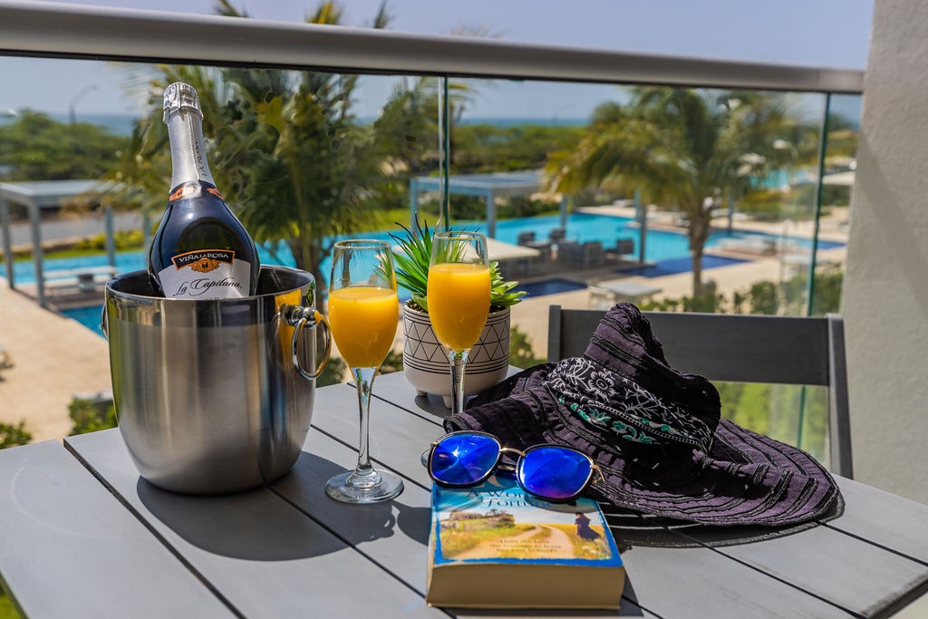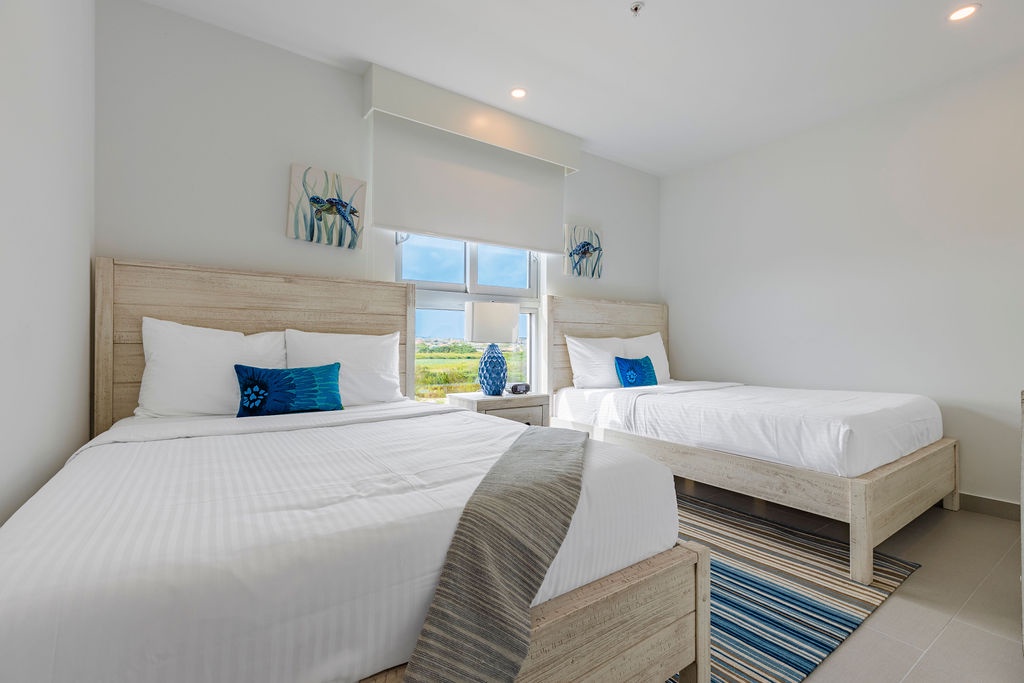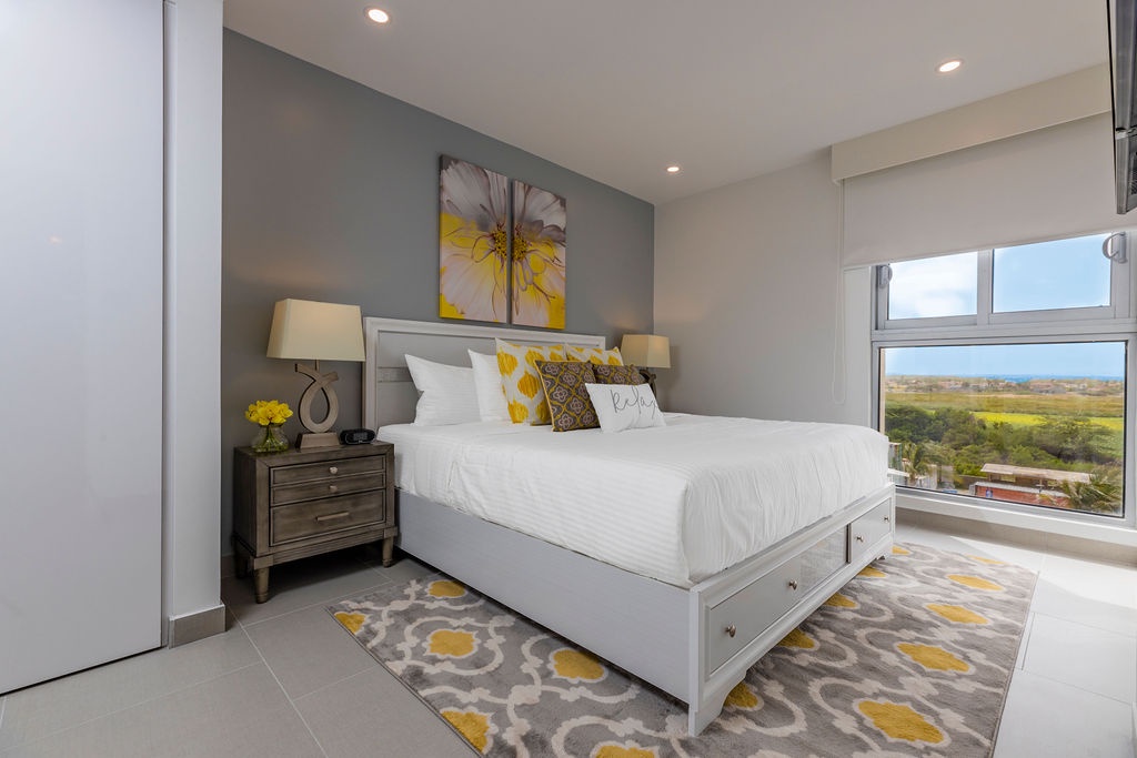 This air-conditioned two-bedroom suite features one King bed, two full beds and two bathrooms with shower, hairdryer, and a fully equipped kitchen, everything that you need for cooking is in here. Dining/living area has the perfect combination for a view: corner unit with more than 180 degrees of view to the Caribbean. Also, a sofa bed which unfolds to a full-size bed is available in this unit. Washer and dryer in the unit. One step into the balcony through sliding doors and let’s drink a couple of wine enjoying the magnificent view. Free Wi-Fi and TV in living room and bedroom.
