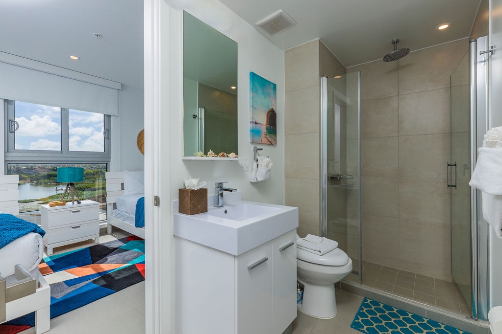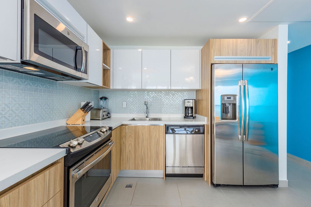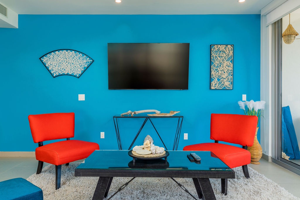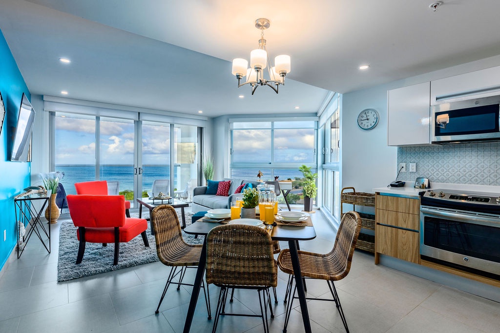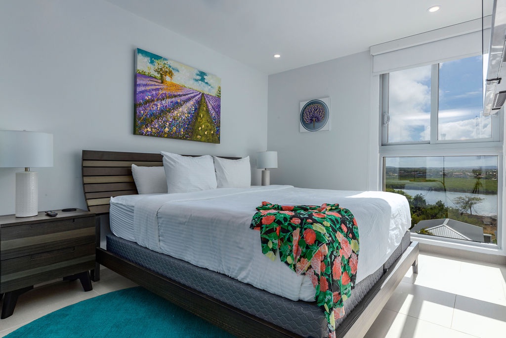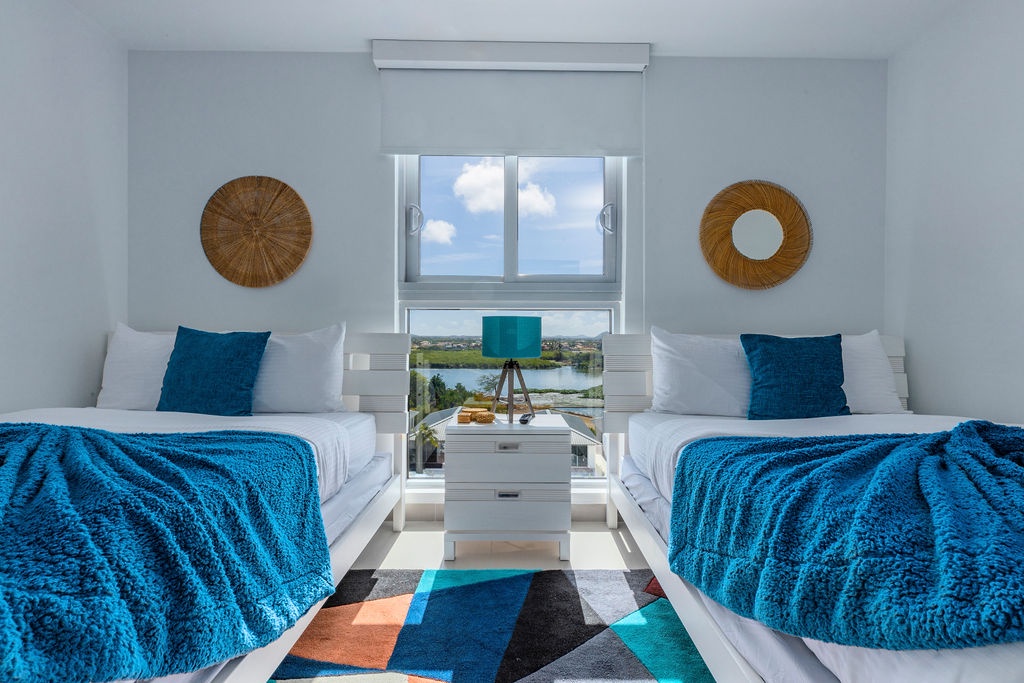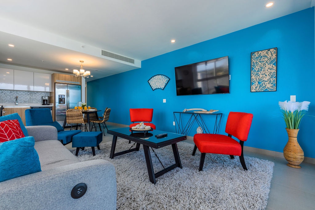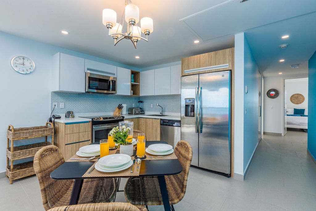 This air-conditioned two-bedroom suite features one King bed, two full beds and two bathrooms with shower, hairdryer, and a fully equipped kitchen, everything that you need for cooking is in here. Dining/living area has the perfect combination for a view: corner unit with more than 180 degrees of view to the Caribbean. Also, a sofa bed which unfolds to a full-size bed is available in this unit. Washer and dryer in the unit. One step into the balcony through sliding doors and enjoy the magnificent view. Free Wi-Fi and TV in living room and bedroom.