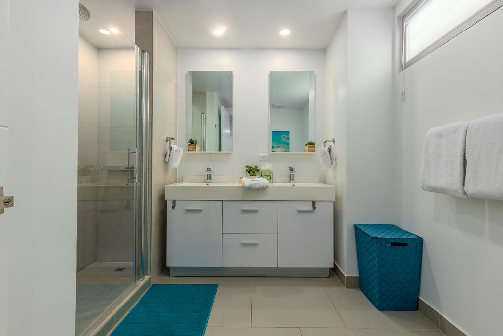 • Each bathroom has their own white towels and blue beach towels in the vanity.