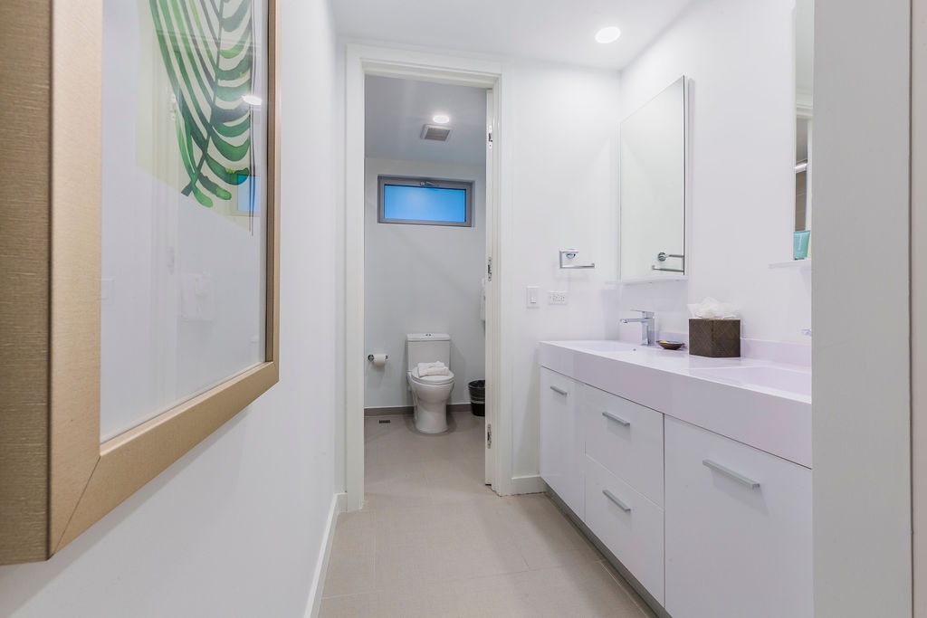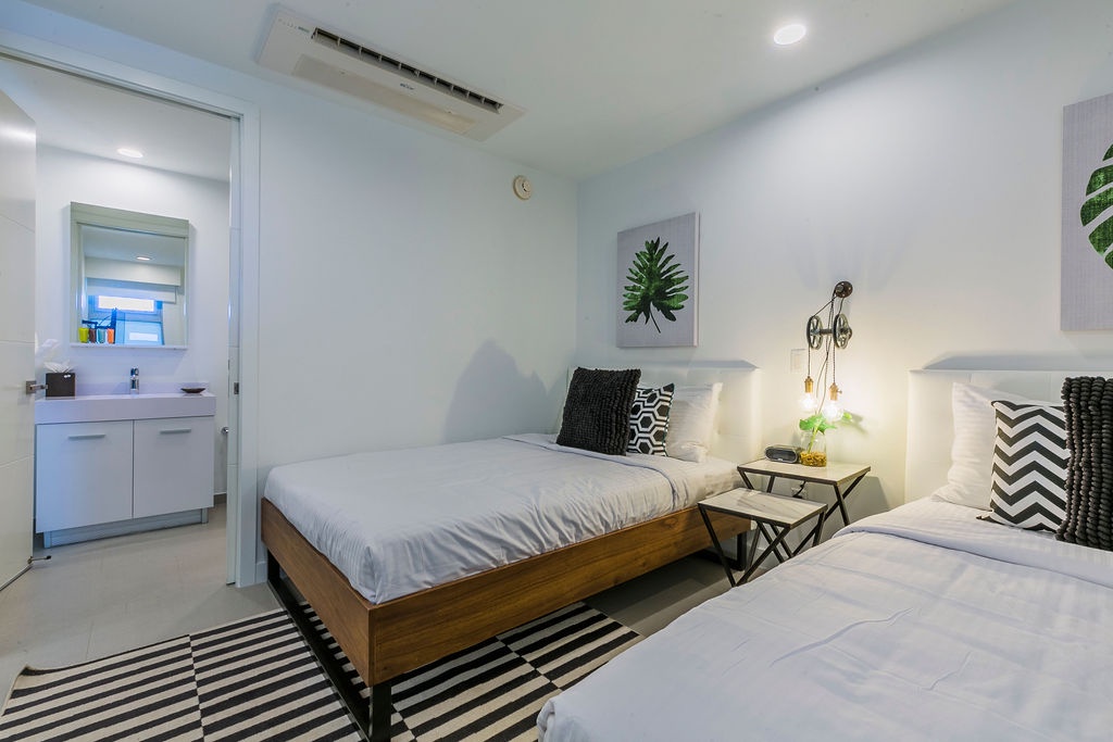 The air-conditioned suite presents a breathtaking ocean view, featuring one king bed and two full beds, two bathrooms with showers and a fully equipped kitchen. The dining and living areas, adorned with an amazing view, include a sofa bed that unfolds into a full-size bed, as well as a convenient washer and dryer. Step onto the balcony and immerse yourself in the ocean panorama.