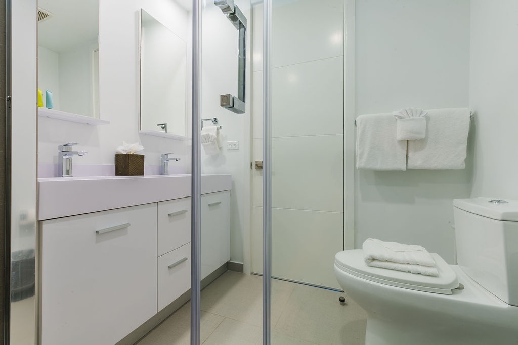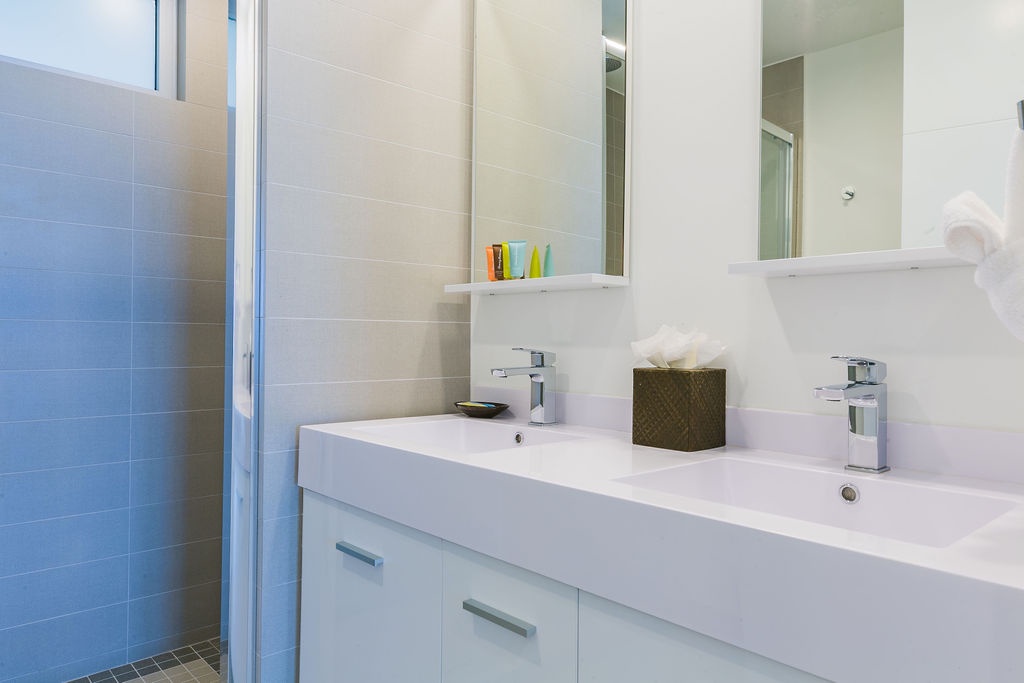• Each bathroom has their own white towels and blue beach towels in the vanity.