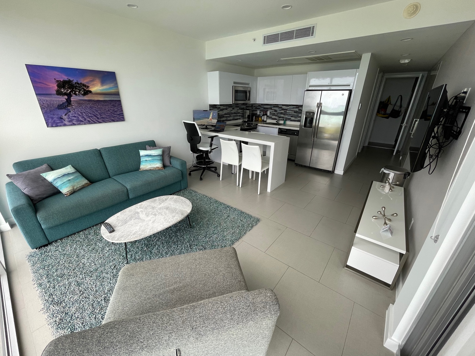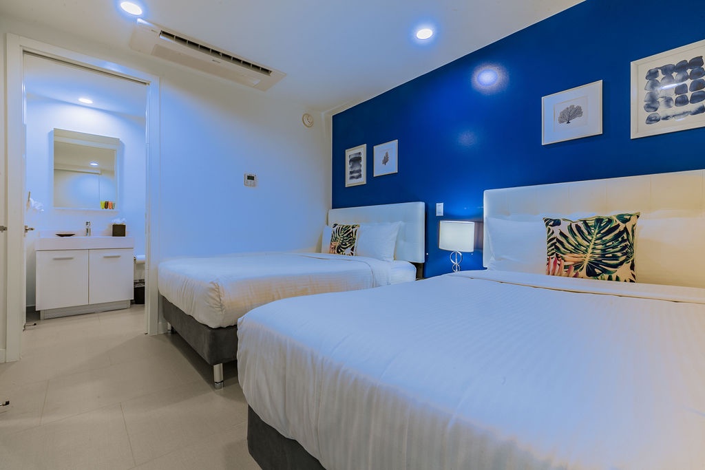 The condo also has central A/C with distinct zones that can be controlled independently to keep everyone comfortable, and a washer and dryer. You will have access to 2 stunning infinity pools, a full workout room, a hot tub, a tennis court (which is lit at night and private lessons are available), and an assigned parking space. Fantastic location a 6-minute walk to Eagle Beach, and a 12-minute walk to Palm Beach, yet set in a quiet area. Two of Aruba’s best restaurants, Infini and Poke Ono, are on-site, and a major grocery store is also just a short walk away. All the shops, restaurants, and casinos of Palm Beach are also within walking distance.