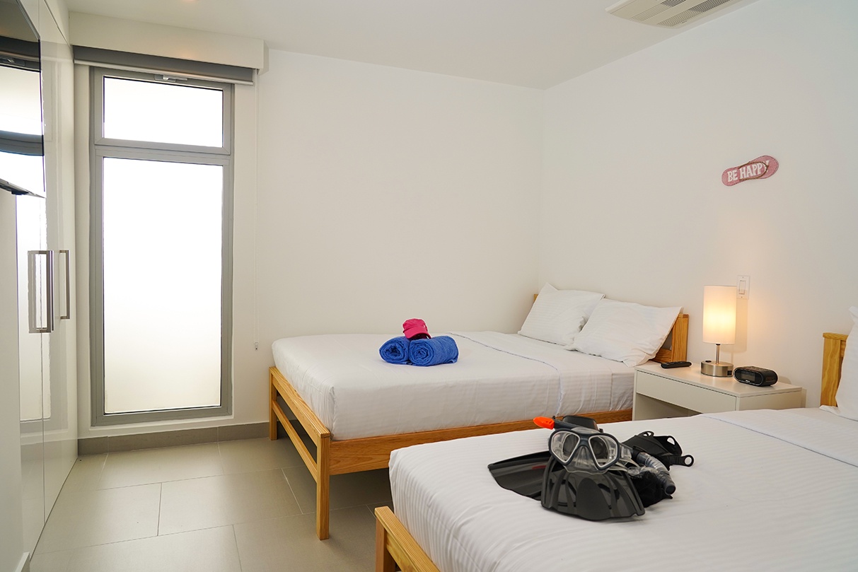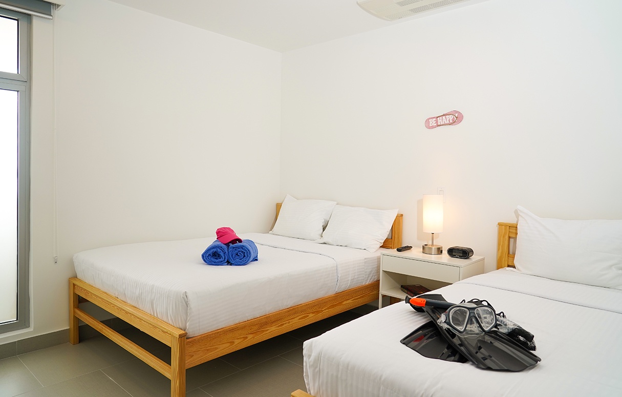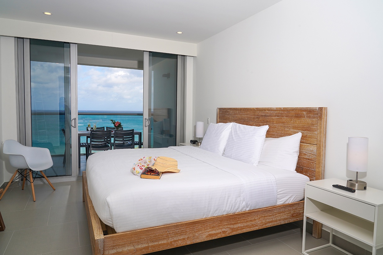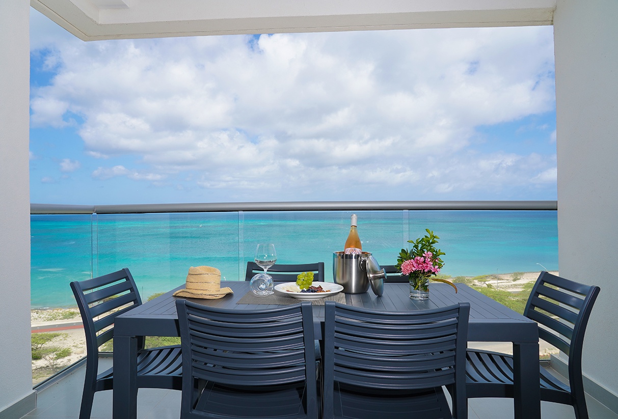This air-conditioned two-bedroom suite features one king bed and two full beds, two bathrooms with shower, hairdryers, and a fully equipped kitchen. Dining/living area has an amazing view of the Caribbean and a sofa bed which unfolds to a full-size bed. Comes with washer and dryer. One step into the balcony through sliding doors and the Caribbean Sea is there, magnificent. Free Wi-Fi and TV’s in all rooms.