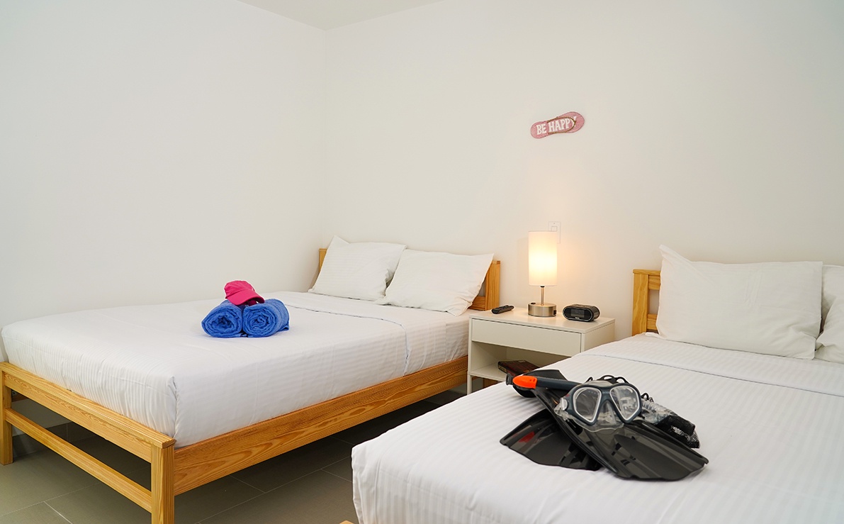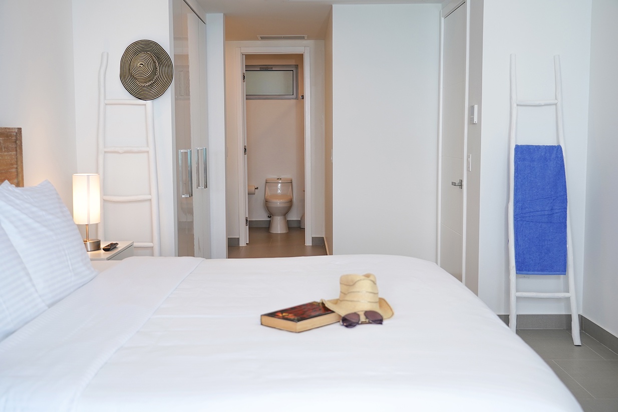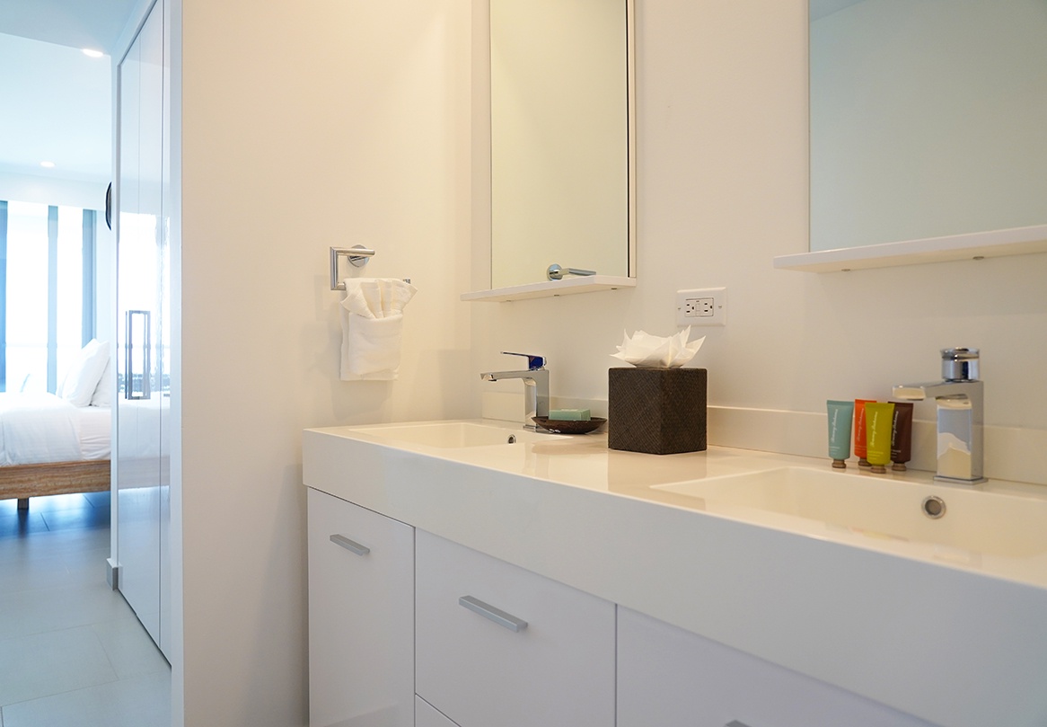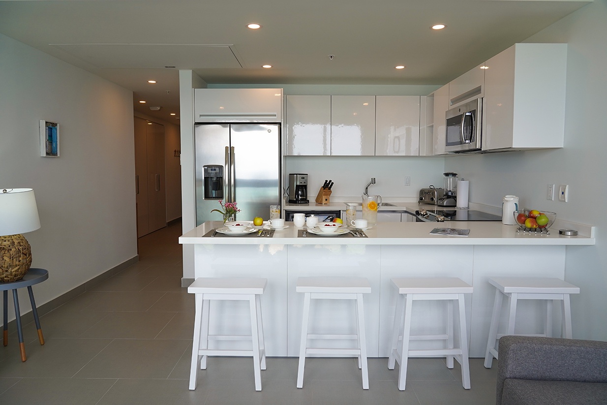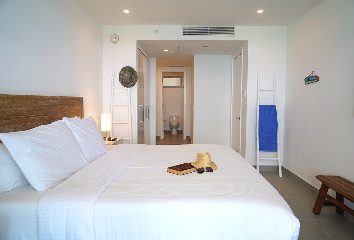 This air-conditioned two-bedroom suite features one king bed and two full beds, two bathrooms with shower, hairdryers, and a fully equipped kitchen. Dining/living area has an amazing view of the Caribbean and a sofa bed which unfolds to a full-size bed. Comes with washer and dryer. One step into the balcony through sliding doors and the Caribbean Sea is there, magnificent. Free Wi-Fi and TV’s in all rooms.