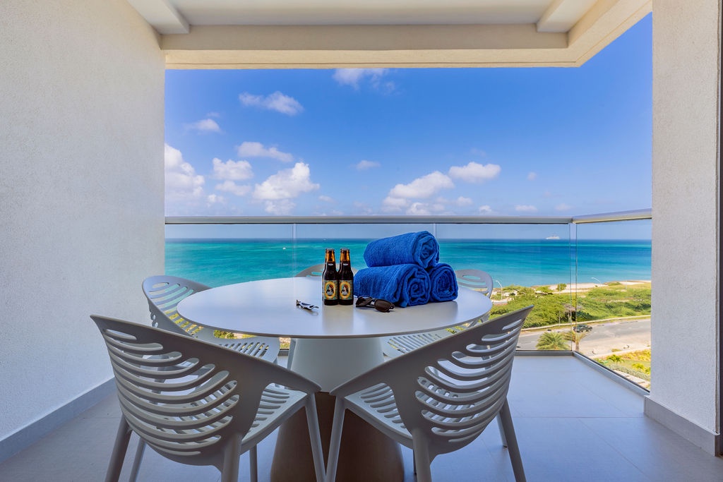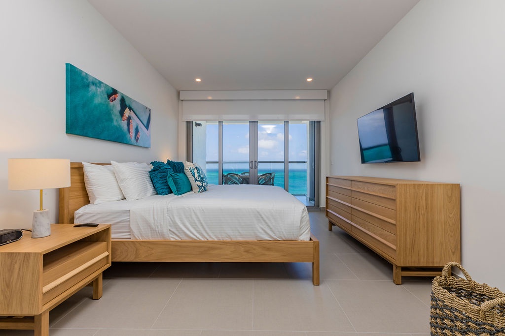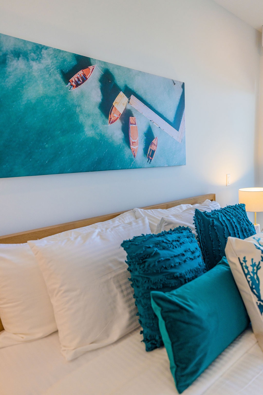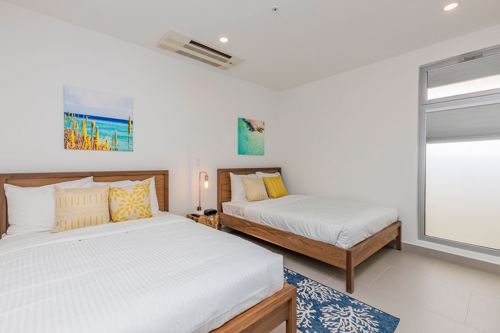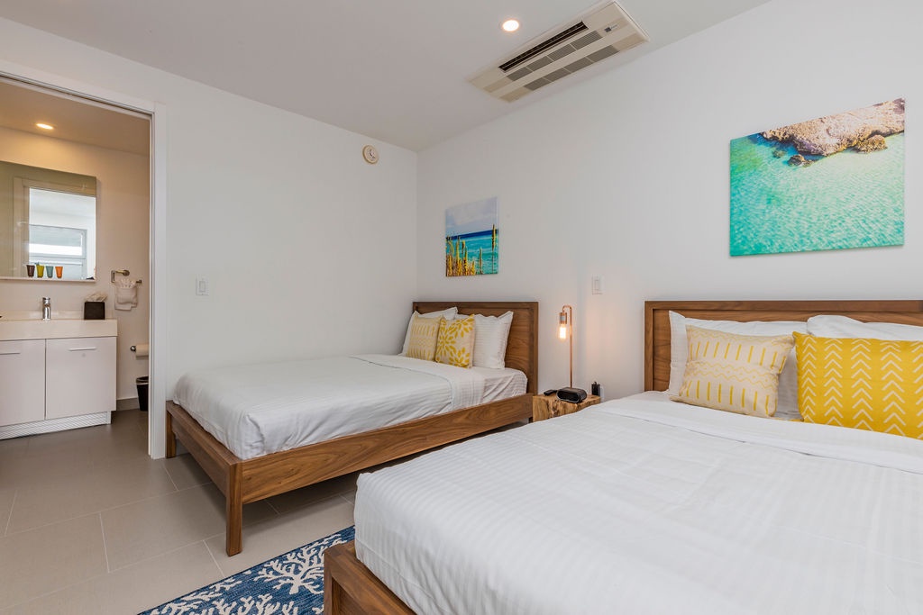This air-conditioned two-bedroom suite features one king bed and two full beds, two bathrooms with shower, hairdryers, and a fully equipped kitchen. Dining/living area has an amazing view of the Caribbean and a sofa bed which unfolds to a full-size bed. Comes with washer and dryer. One step into the balcony through sliding doors and the Caribbean Sea is there, magnificent. Free Wi-Fi and TV’s in all rooms.