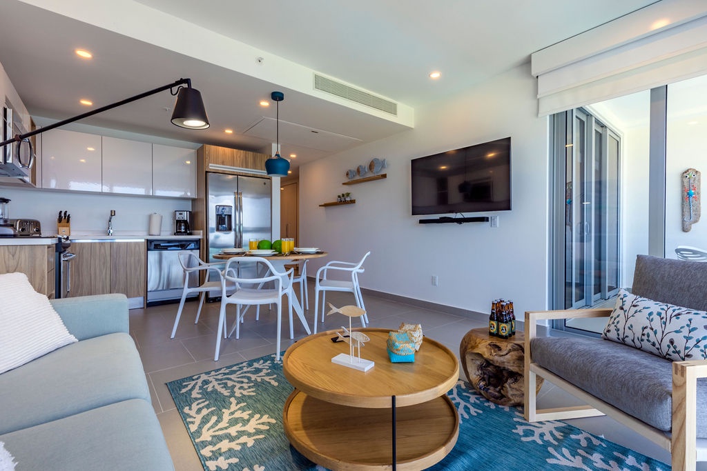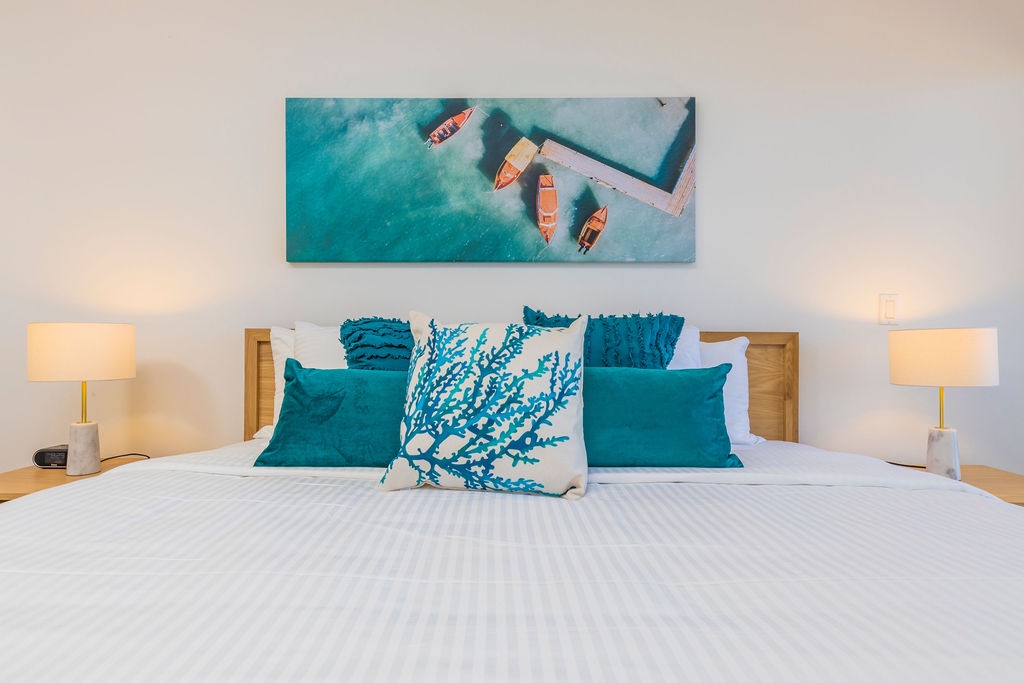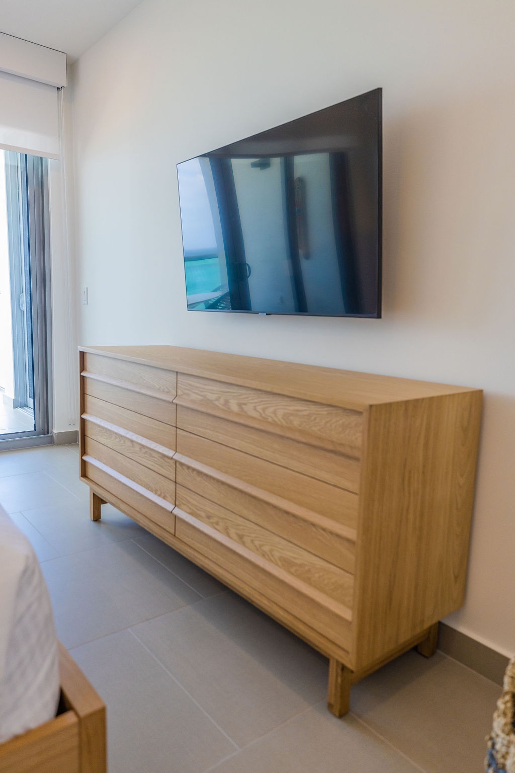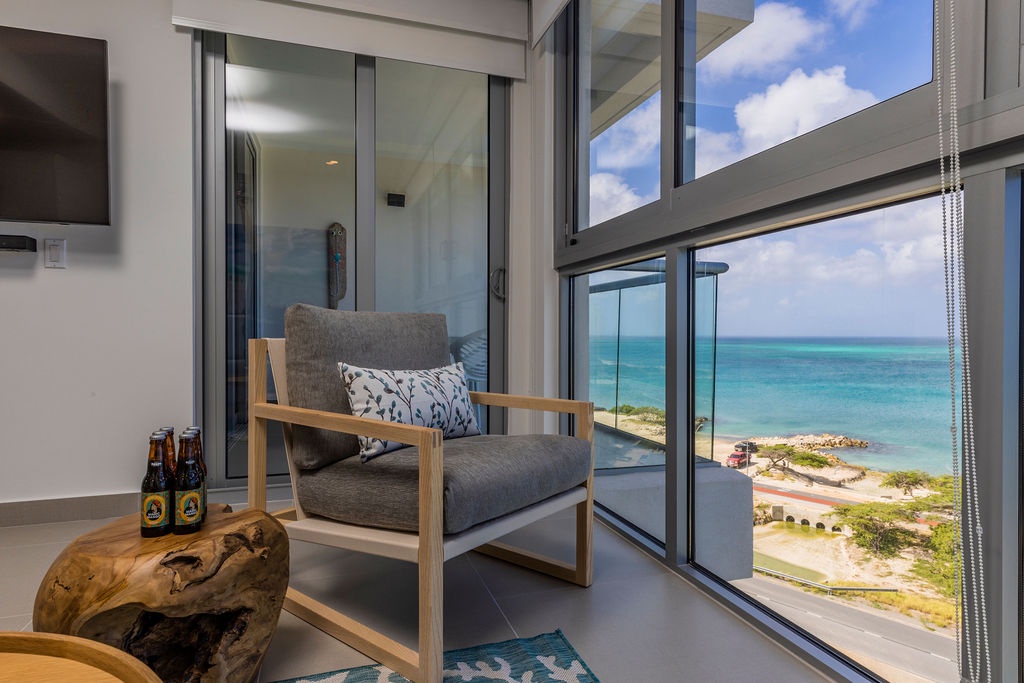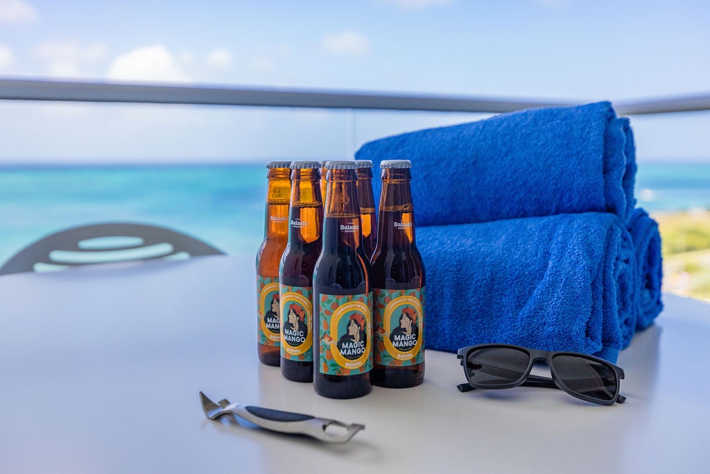 This air-conditioned two-bedroom suite features one king bed and two full beds, two bathrooms with shower, hairdryers, and a fully equipped kitchen. Dining/living area has an amazing view of the Caribbean and a sofa bed which unfolds to a full-size bed. Comes with washer and dryer. One step into the balcony through sliding doors and the Caribbean Sea is there, magnificent. Free Wi-Fi and TV’s in all rooms.