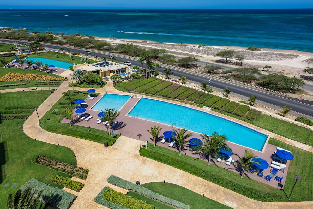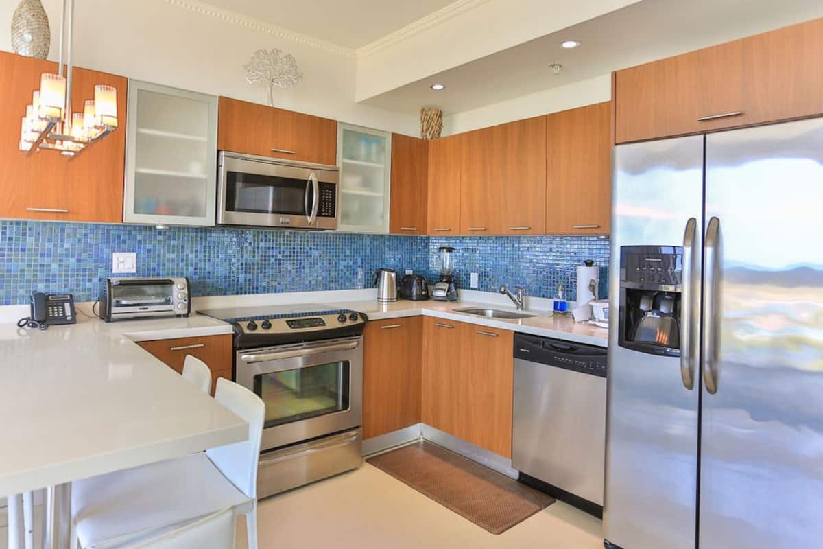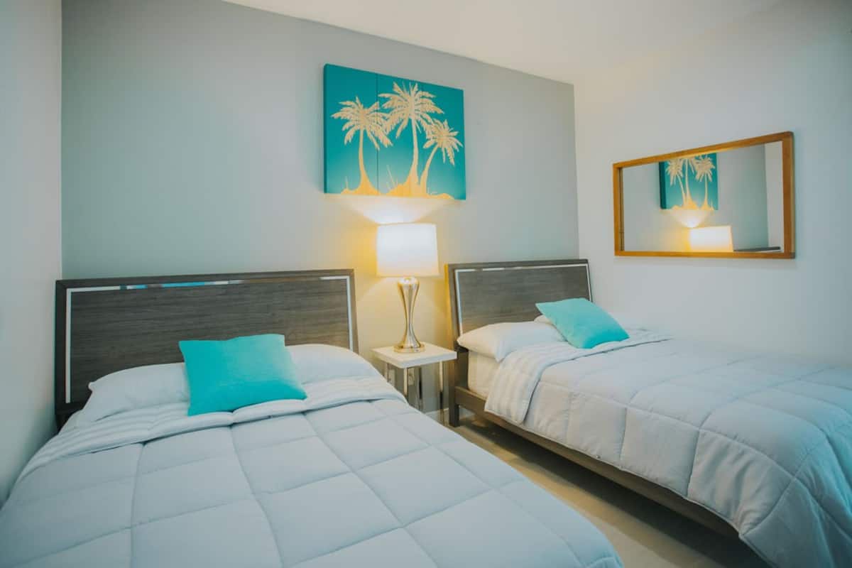 This air- conditioned two-bedroom suite is very relaxing and comfortable. It features an amazingly appointed kitchen, a dining table and a nice living area, master bedroom with King-size bed and private full bathroom, second bedroom with two full-size beds and a private full bathroom, washer and dryer. One step onto the balcony through sliding doors as you gaze out at the ocean. Free Wi-Fi and TVs in all rooms.