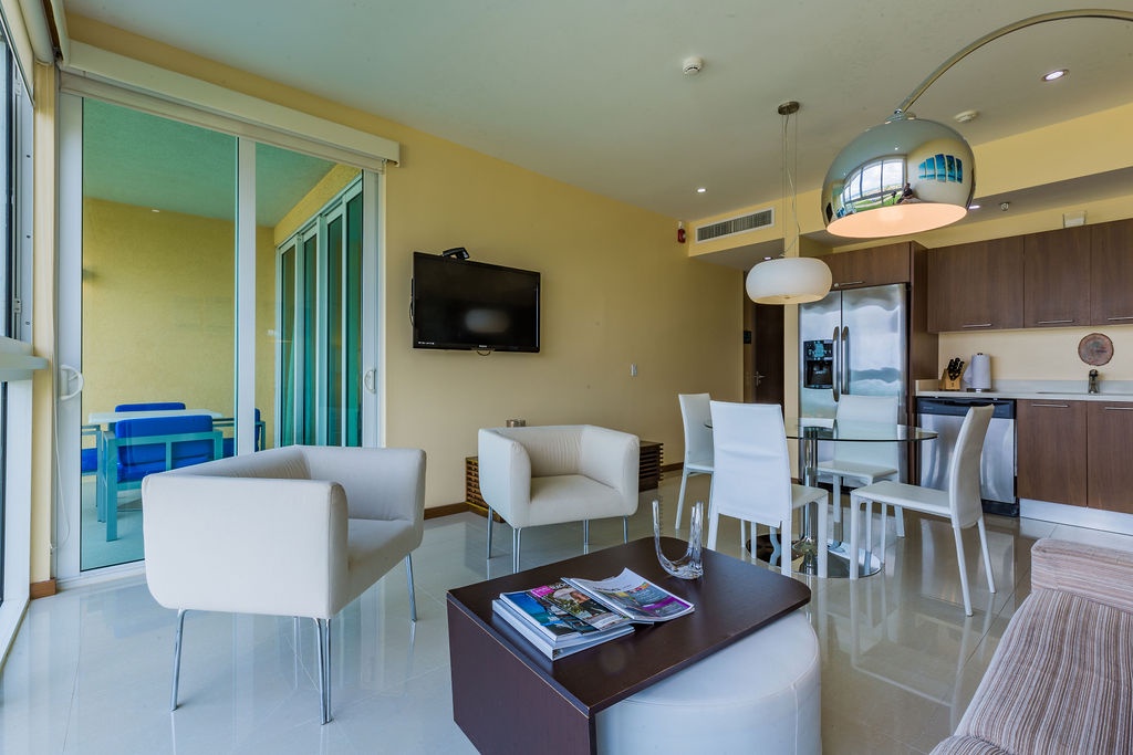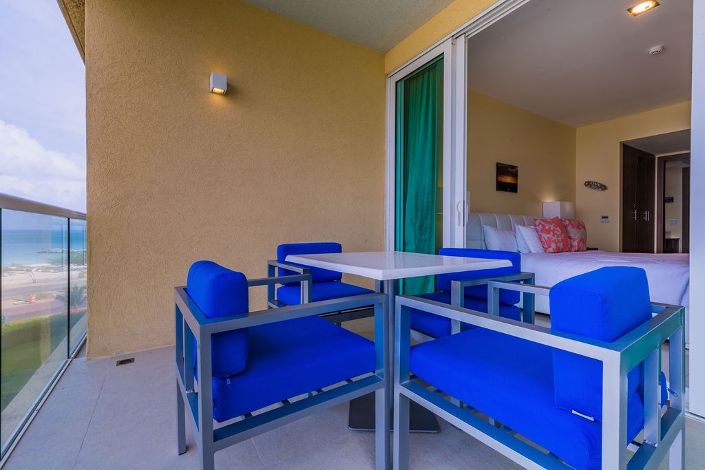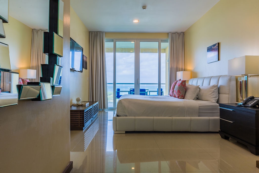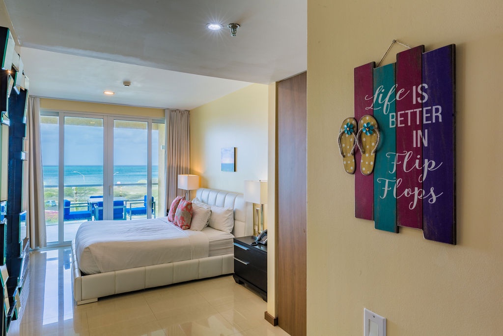 This air-conditioned two-bedroom suite has a spectacular ocean view. Featuring one King-size bed and two full beds, two full bathrooms with hairdryers, full equipped kitchen, dining and living area with sofa which unfolds to a full-size bed, washer and dryer. One step onto the balcony through sliding doors as you gaze out at the ocean. The Master bedroom has an ocean view as well. Free Wi-Fi and TV’s in all rooms.