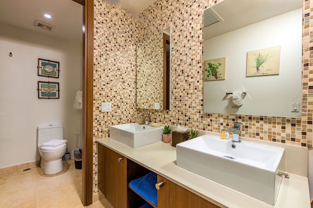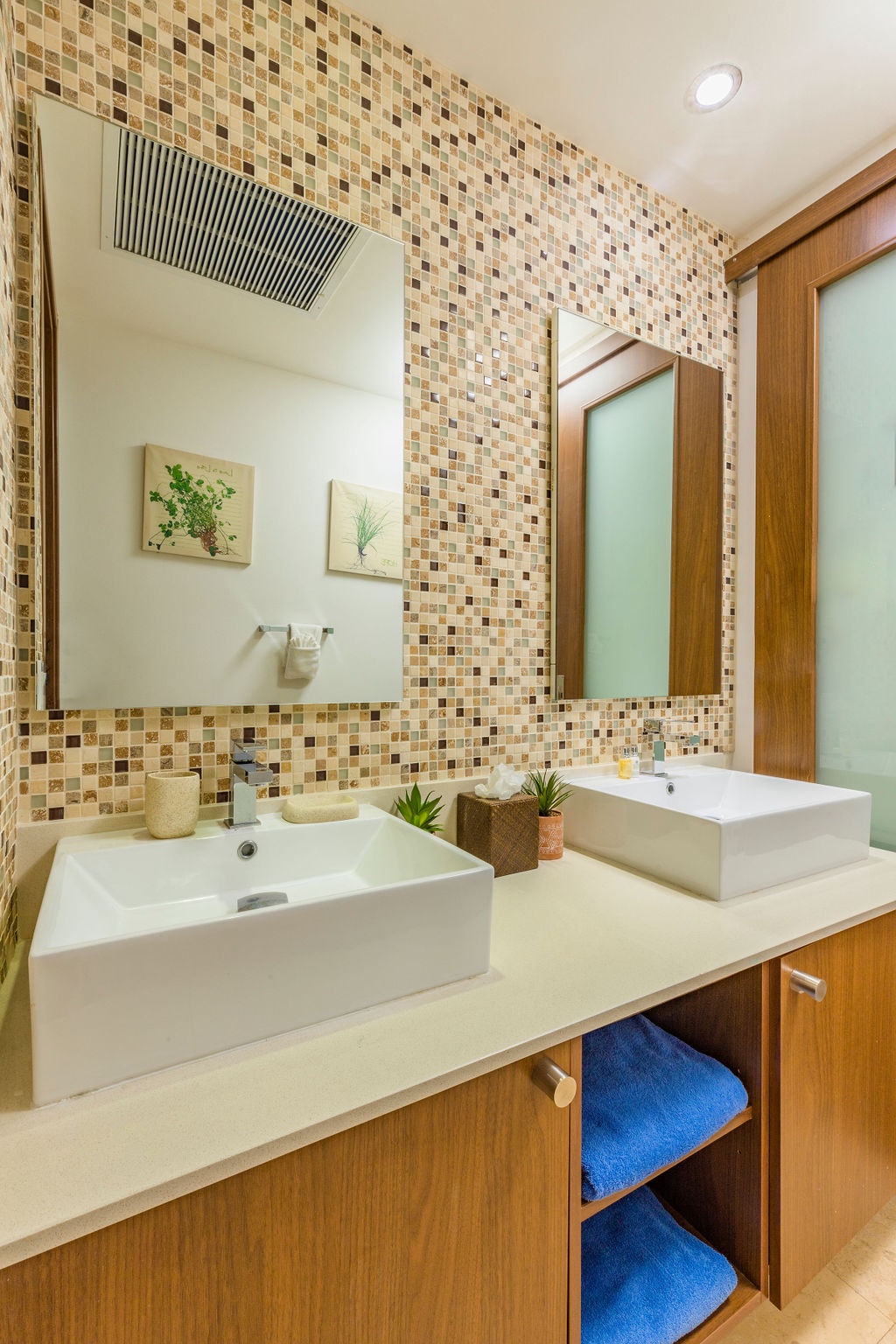 • Each bathroom has their own white towels and blue beach towels in the vanity.