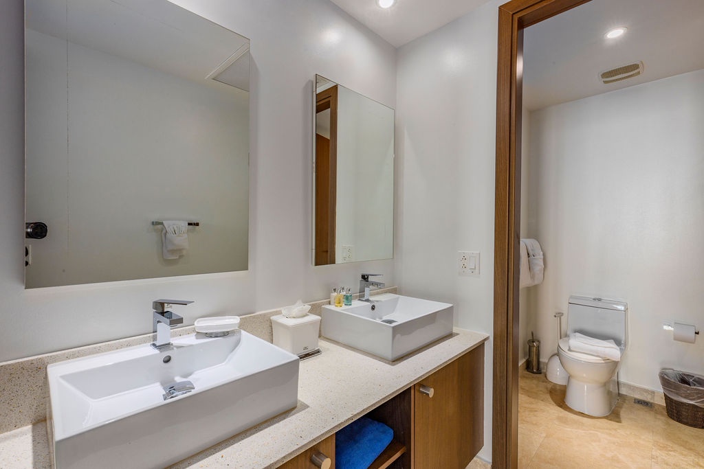 You will enjoy a well-equipped kitchen, along with a dining and living area with a sofa sleeper and a balcony where you can stare at the water and enjoy a perfect view of the sunset all year round. The spacious primary bedroom has a large king bed, and wall-to-wall views of the Caribbean, pools, and gardens. The guest bedroom is comfortably furnished with two double beds, ample storage space and closets. Each bedroom has a private bathroom with large showers and rain shower heads that will feel wonderful after enjoying a day on the beach. The condo is equipped with central AC, washer/dryer, large smart TVs in all rooms, room safe, iron / ironing board, hairdryers, beach towels, beach cooler, and free WIFI throughout the property (1010 sqft for a maximum of 6 guests).