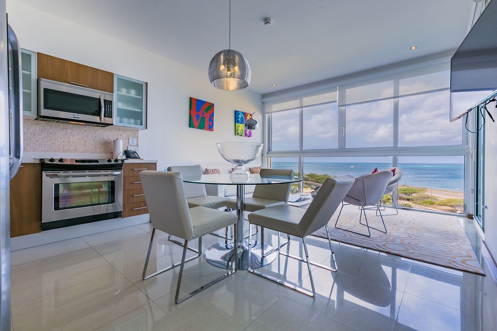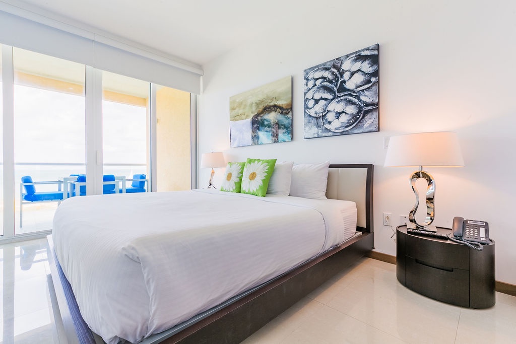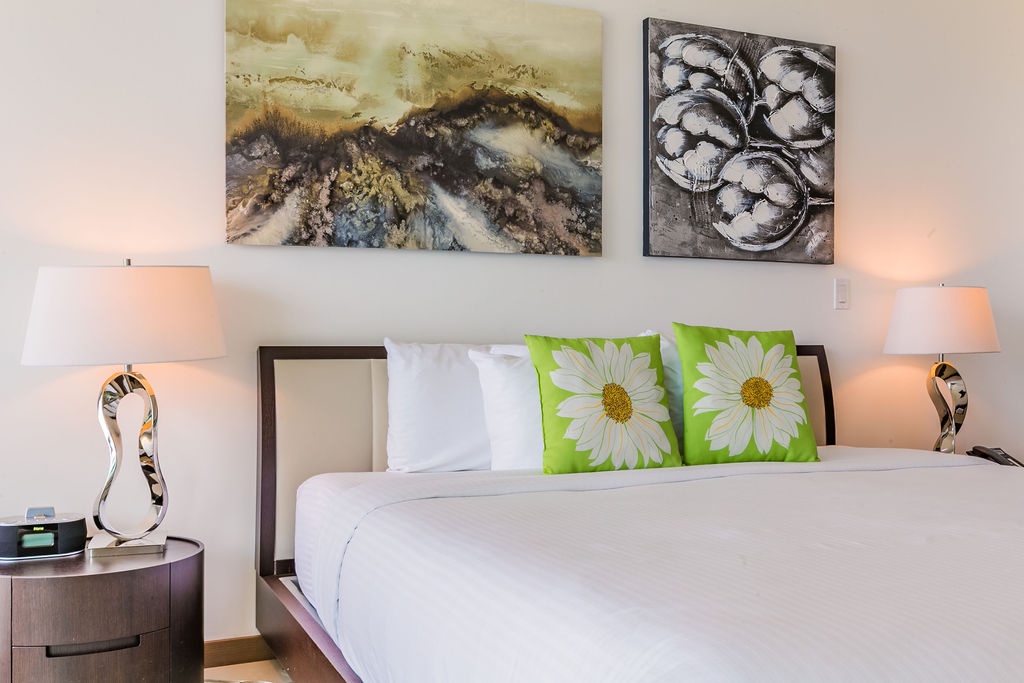 This air-conditioned two-bedroom suite has a spectacular ocean view. Featuring one King-size bed and two full-size beds, two full bathrooms with hairdryers, fully equipped kitchen, dining and living area with sofa bed which unfolds to a full-size bed, and washer and dryer. One step onto the balcony through sliding doors as you gaze out at the ocean. The Master bedroom has an ocean view as well. Free Wi-Fi and TV’s in all rooms.