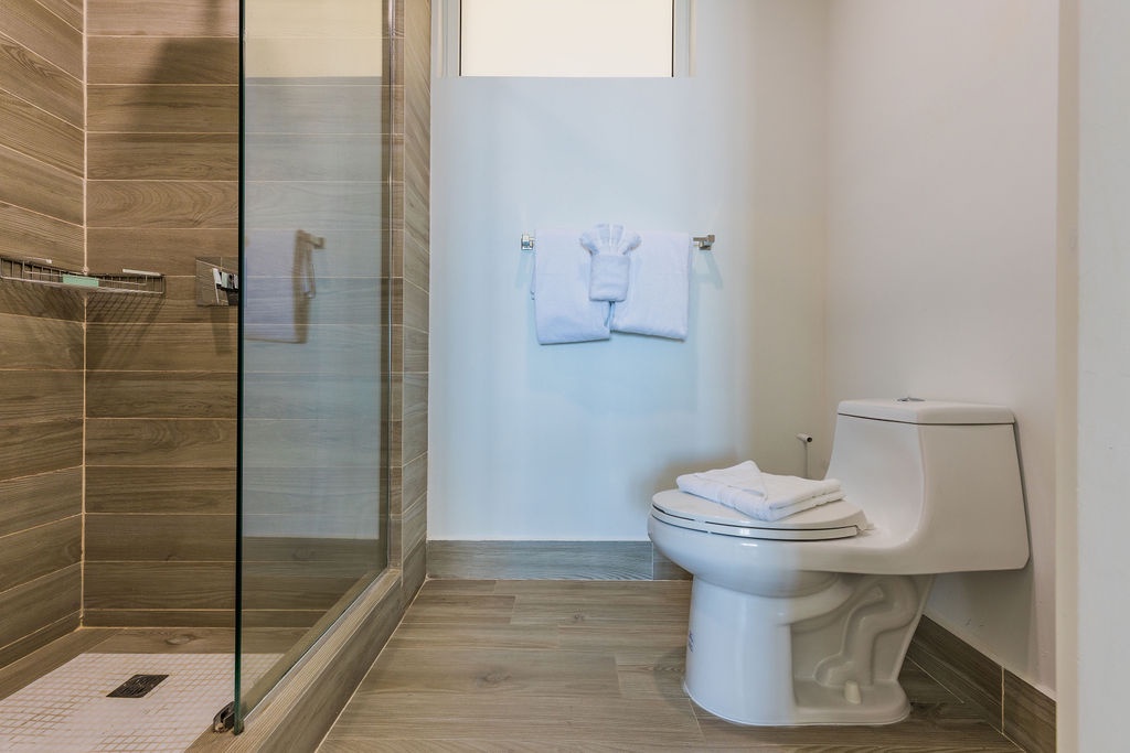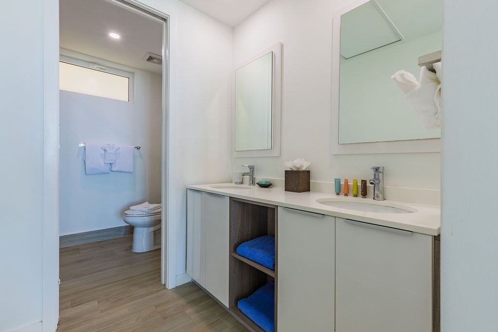 • Each bathroom has their own white towels and blue beach towels in the vanity.