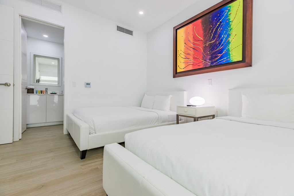 Master bedroom with King-size bed and a full bathroom. Guest bedroom with two Full beds and full bathroom. Fully equipped kitchen. Every room and living room has a TV, and you will have Wi-Fi all around the unit and the property.