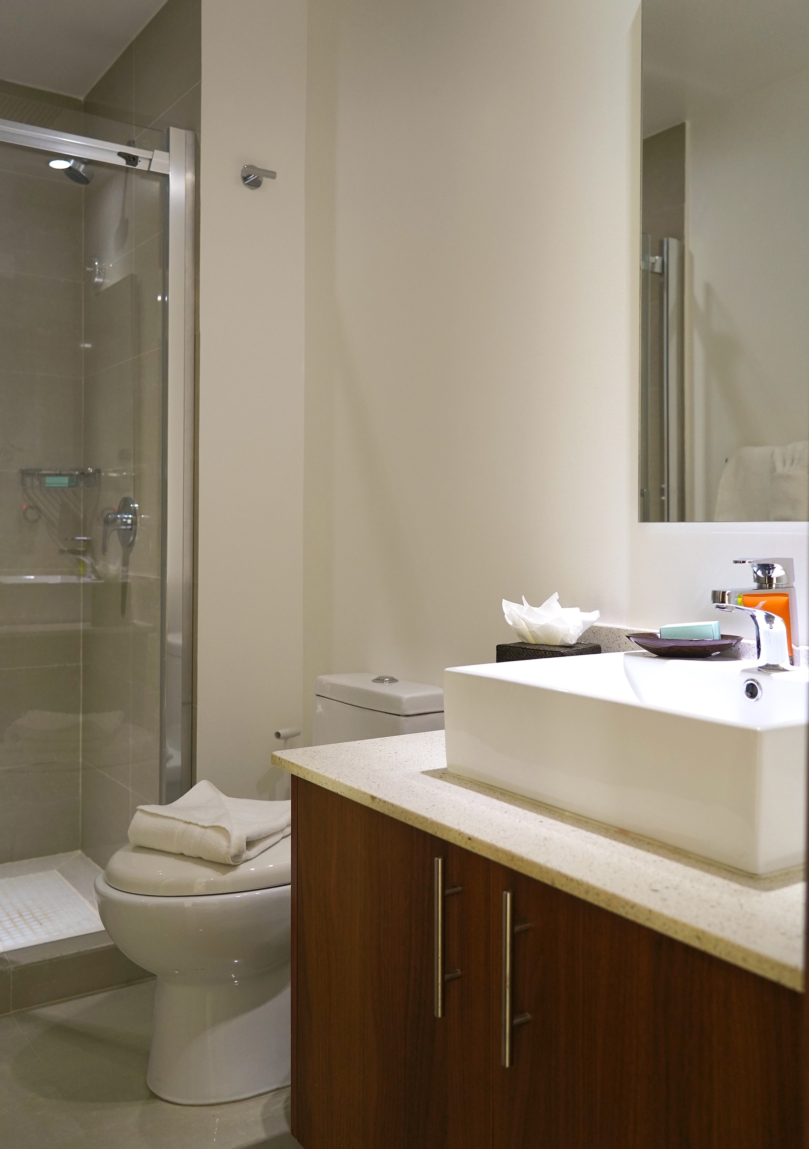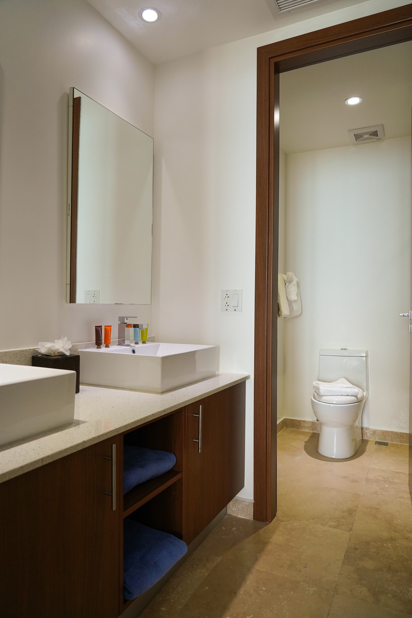 • Each bathroom has their own white towels and blue beach towels below the closet sink