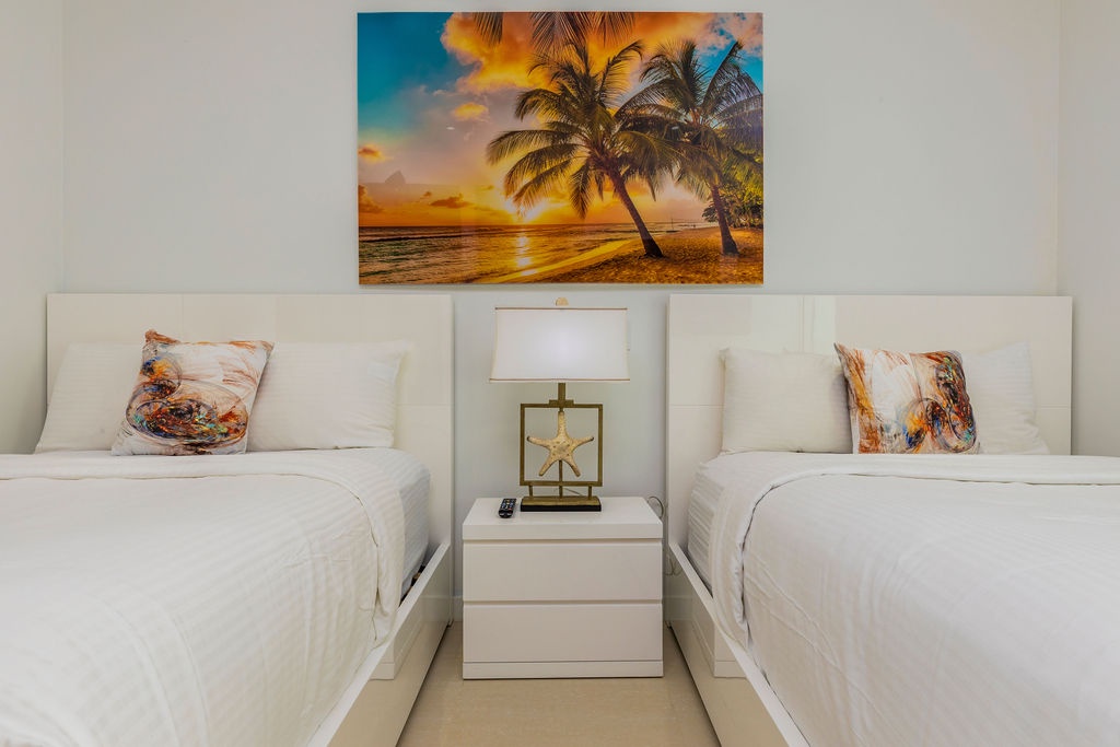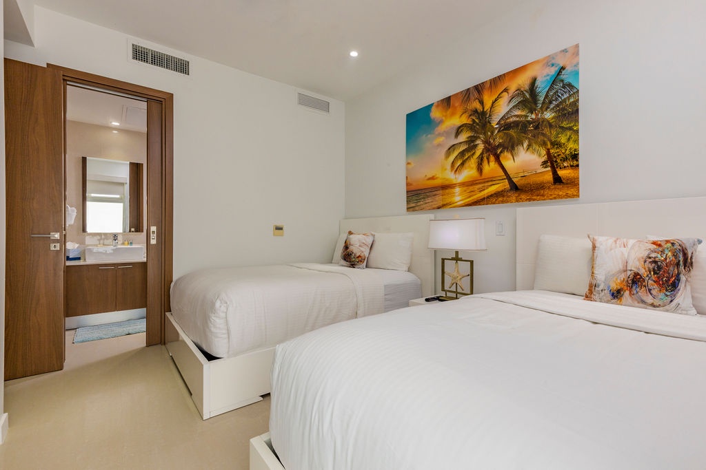 This air-conditioned two-bedroom suite has a spectacular ocean view. Featuring one King bed and two full beds, two full bathrooms with hairdryer, a fully equipped kitchen, a dining and living area with sofa bed which unfolds to a full-size bed, and washer and dryer. One step onto the balcony through sliding doors as you gaze out at the ocean. The Master bedroom has a beautiful ocean view as well as the living room area. Free Wi-Fi and TV’s in all rooms.