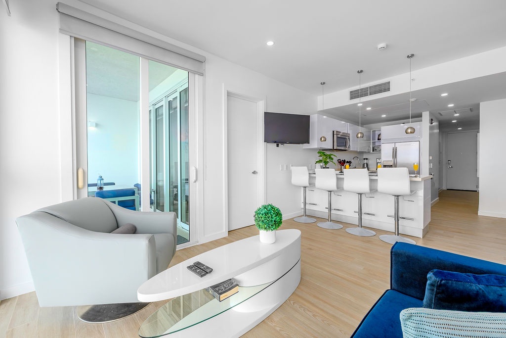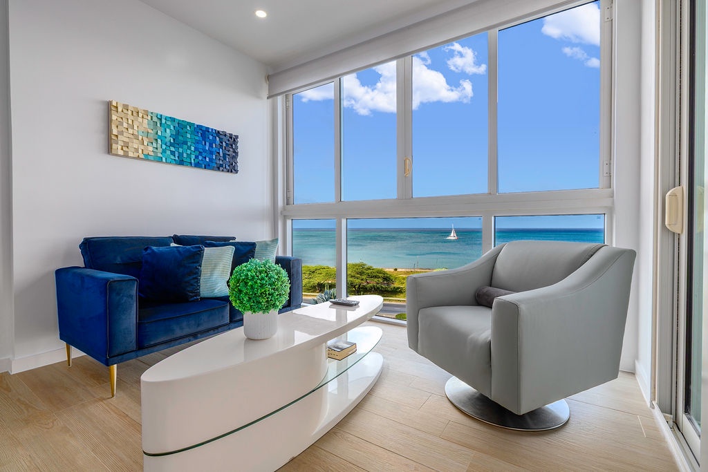 Step into the open-concept living and dining area, where large windows flood the space with natural light, offering breathtaking views of the ocean. The contemporary kitchen is fully equipped with modern appliances, including a refrigerator, oven, and microwave, allowing you to prepare delicious meals with ease. Whether you're sipping coffee on the furnished balcony or enjoying a meal at the sleek dining table, the ocean views will captivate you at every turn.