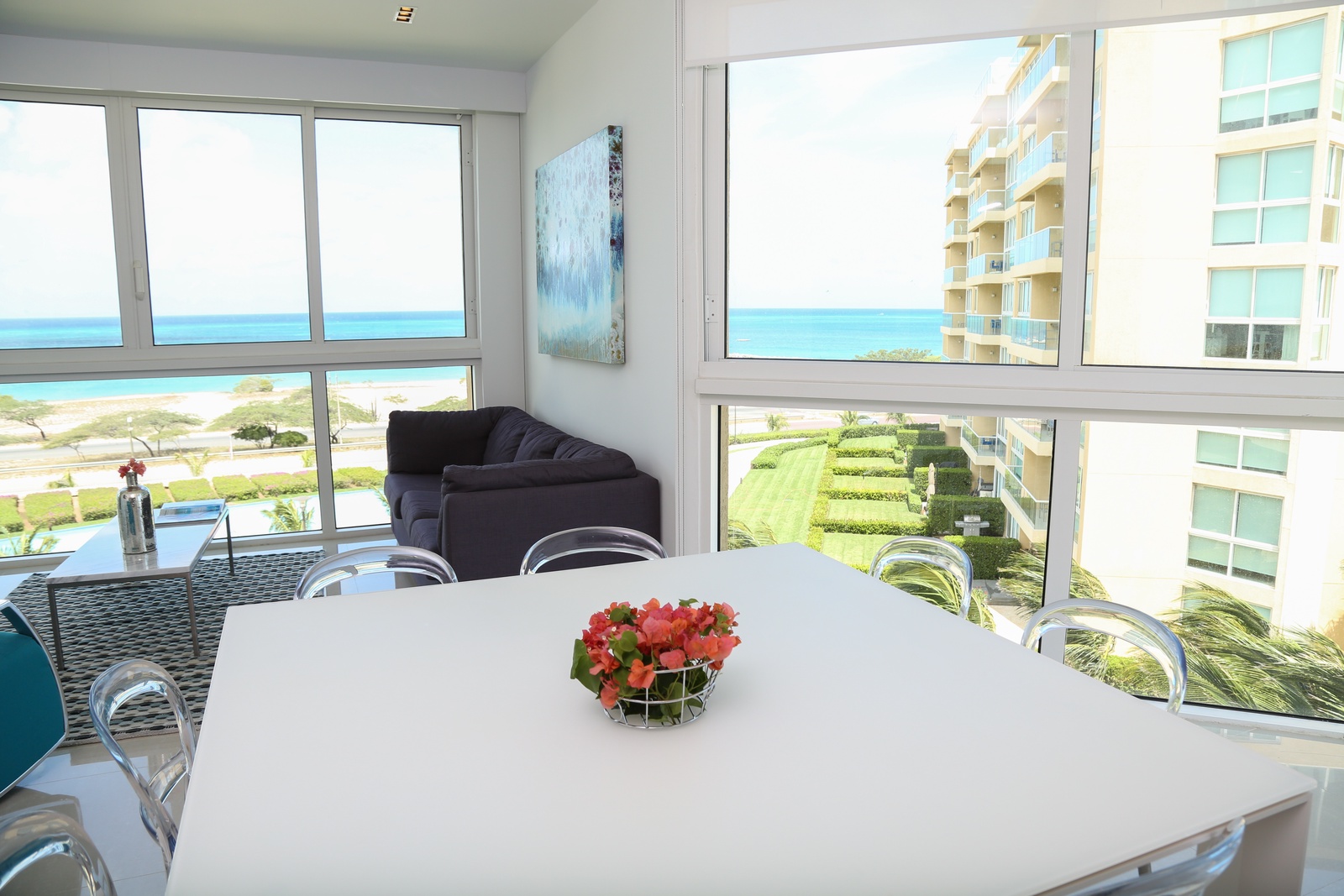 This air- conditioned two-bedroom suite is very relaxing and modern. From this condo you will enjoy spectacular 180-degree views of the Caribbean. It features an amazingly appointed kitchen, a dining table for 8 and a nice living area, master bedroom with King-size bed and private full bathroom, second bedroom with two full-size beds and a private full bathroom, washer and dryer. One step onto the balcony through sliding doors as you gaze out at the ocean. Free Wi-Fi and TVs in all rooms.
