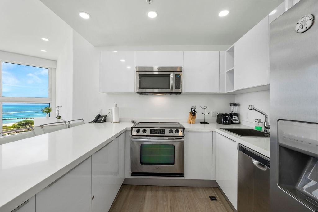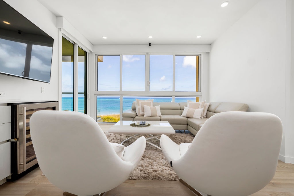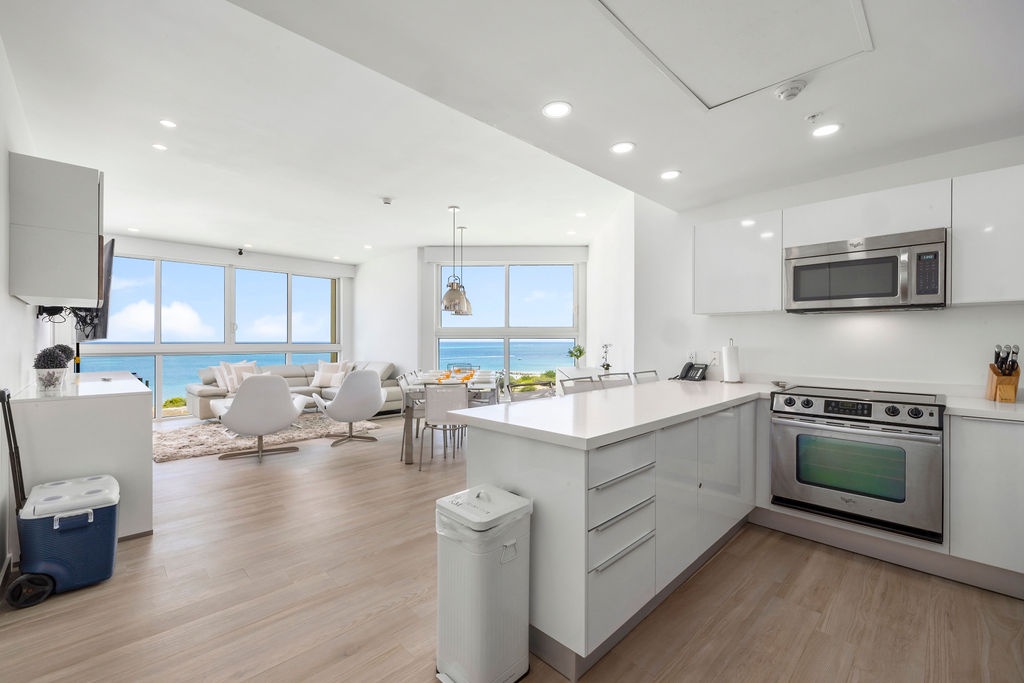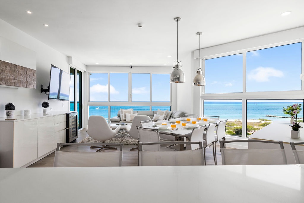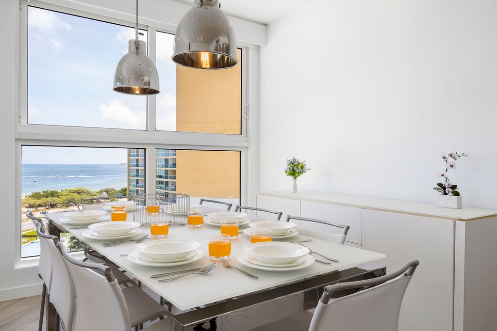 Corner-located condo, wide open view from the kitchen and living room area, it's a nice open space to enjoy with family and friends. Beautiful view from dining table perfect for an early dinner watching the sunset. Two bedrooms each with its own full bathroom. Master bedroom with a King-sized bed, second bedroom with a Bunk bed with a queen-sized bed included. Unit has a comfortable balcony space to enjoy the ocean view. Fully equipped kitchen with all utensils needed for your meals and more.
