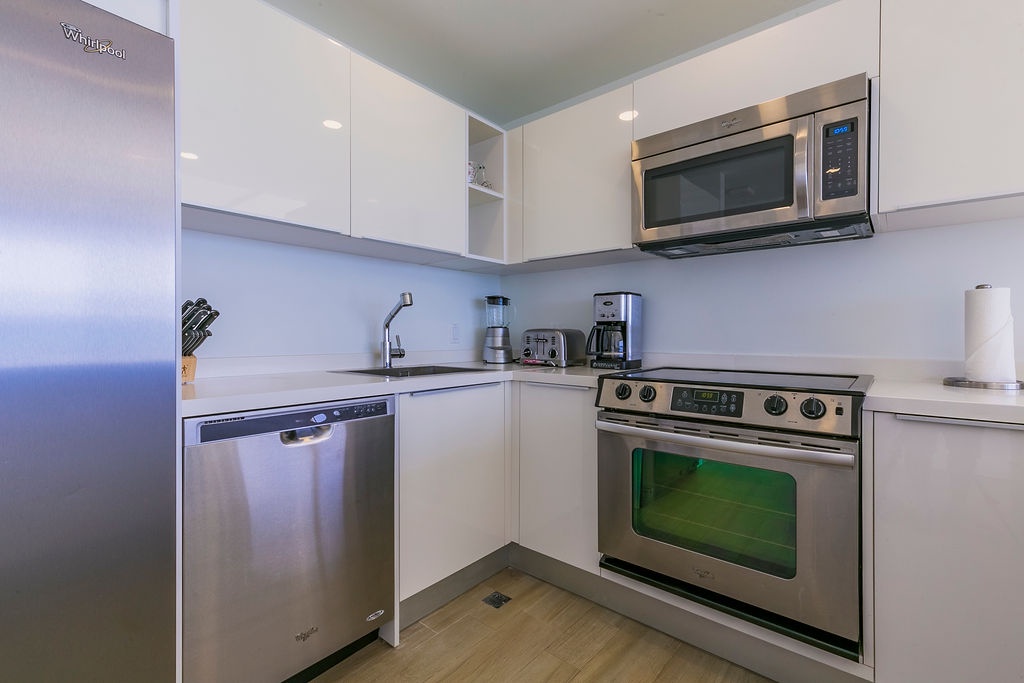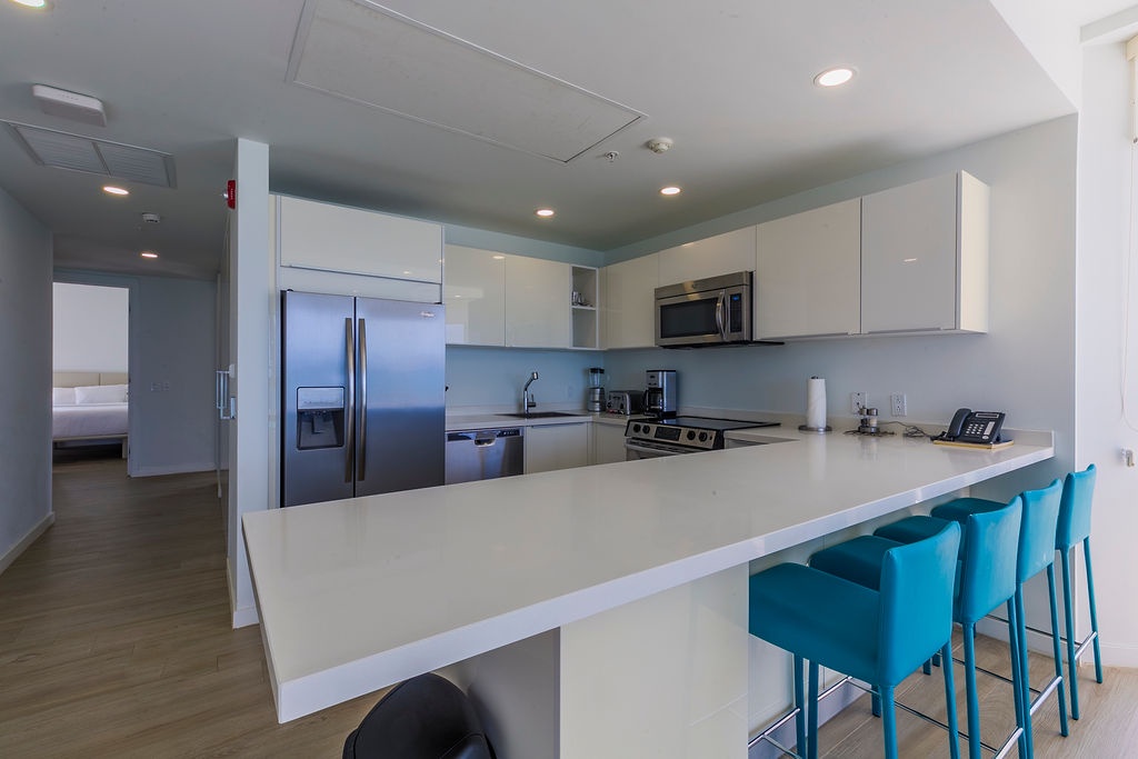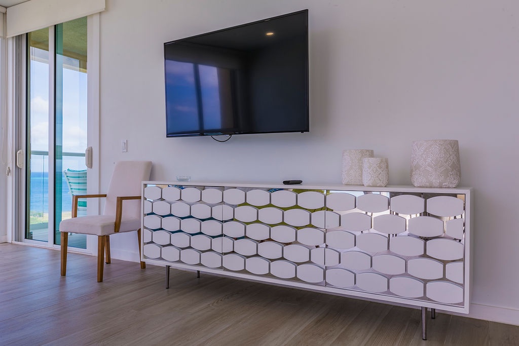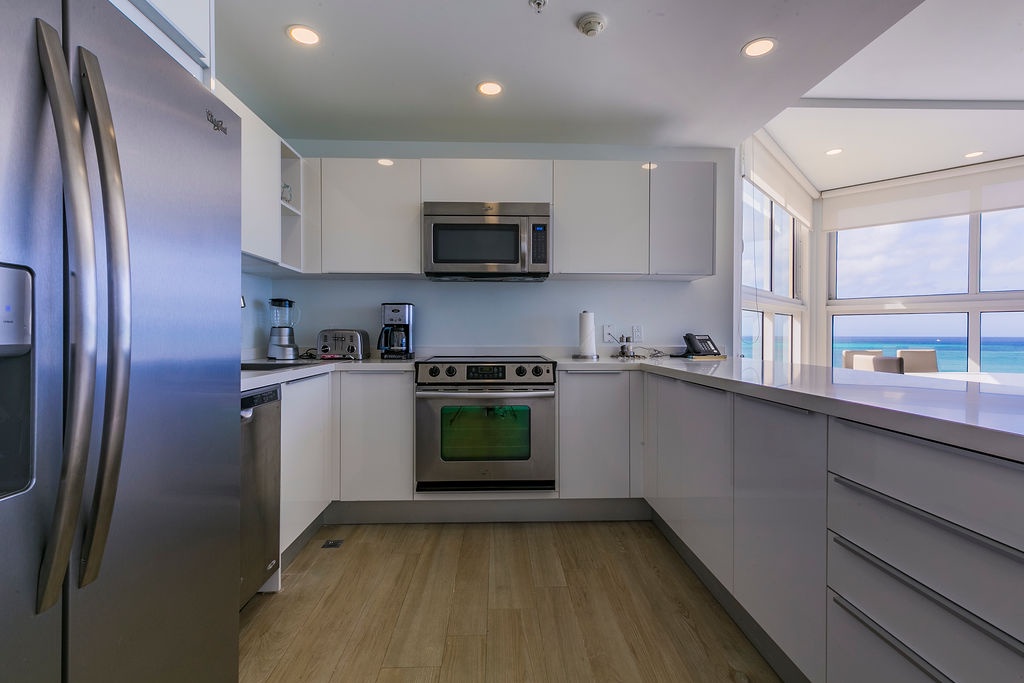 Corner-located condo, wide open view from the kitchen and living room area, it's a nice open space to enjoy with family and friends. Beautiful view from dining table perfect for an early dinner watching the sunset. Two bedrooms each with its own full bathroom. Master bedroom with a Queen bed, second bedroom with two double-size beds. Unit has a comfortable balcony space to enjoy the ocean view. Fully equipped kitchen with all utensils needed for your meals and more.