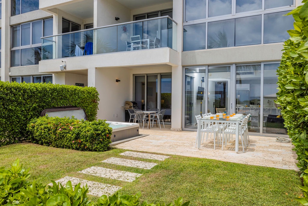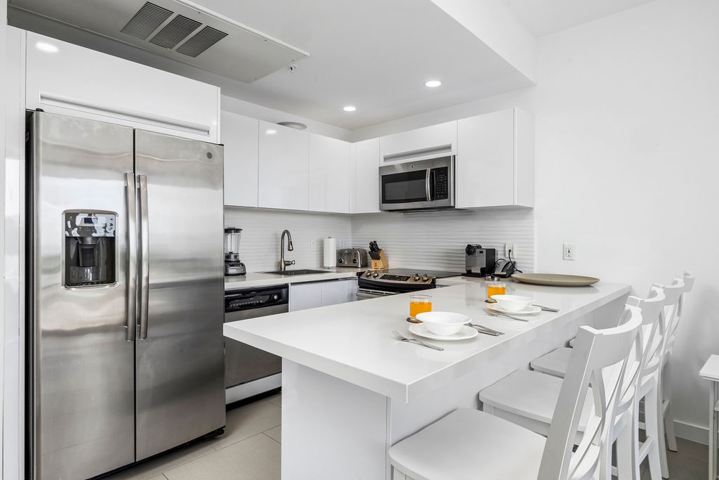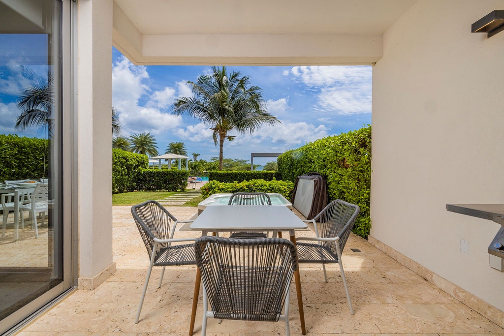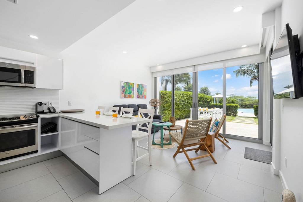 Whip up delicious meals in the chic, fully equipped kitchen, boasting white quartz countertops and custom glossy cabinets. Stainless steel appliances include a side-by-side fridge with an ice maker, convection oven, microwave, four-burner electric stove, and dishwasher. Start your day at the breakfast bar, which comfortably seats four, or dine al fresco on the patio, soaking up the tropical breeze and Caribbean vibes. As evening falls, fire up the BBQ grill to cook juicy steaks under the stars. The open layout keeps you connected to the action, whether you’re cooking or dining.
