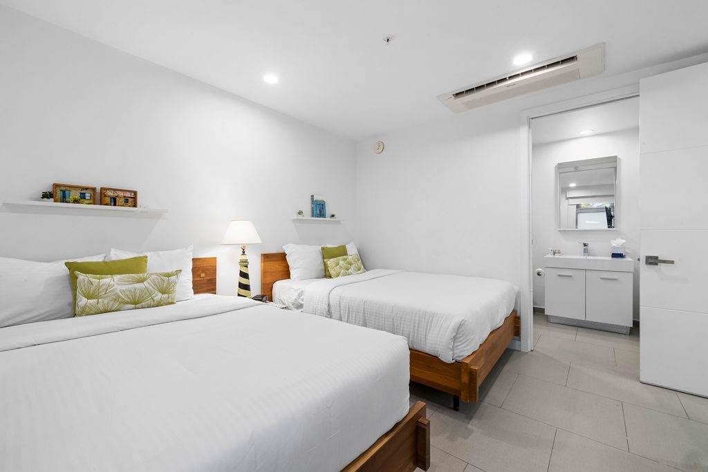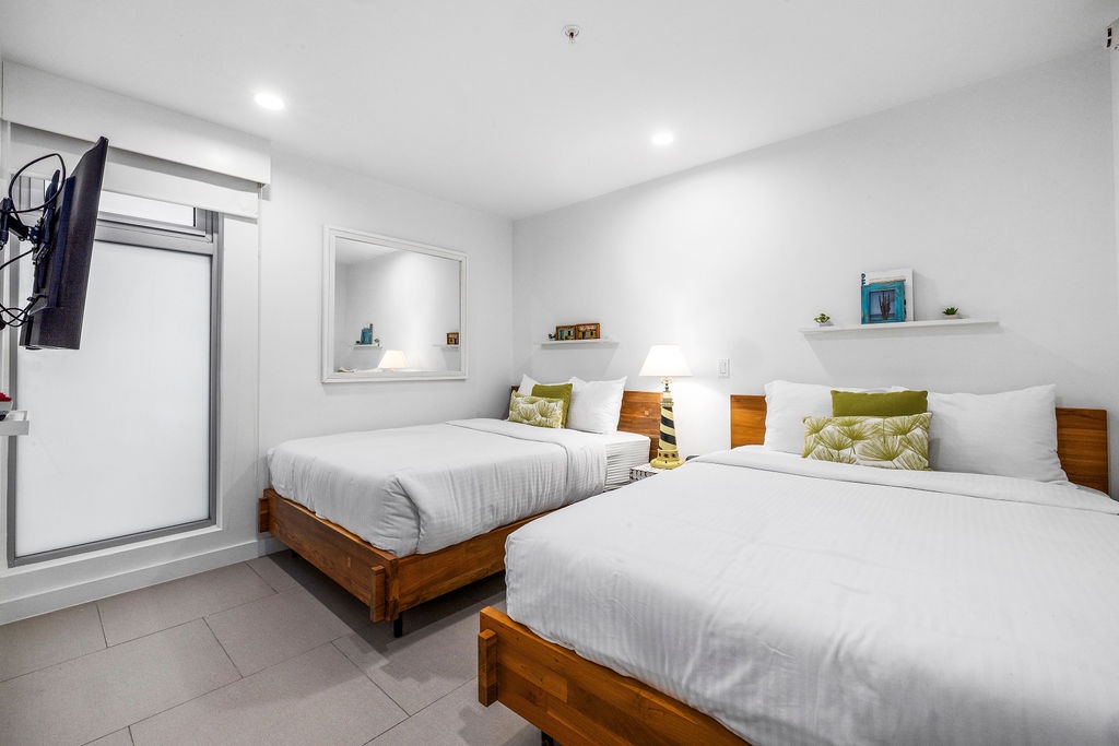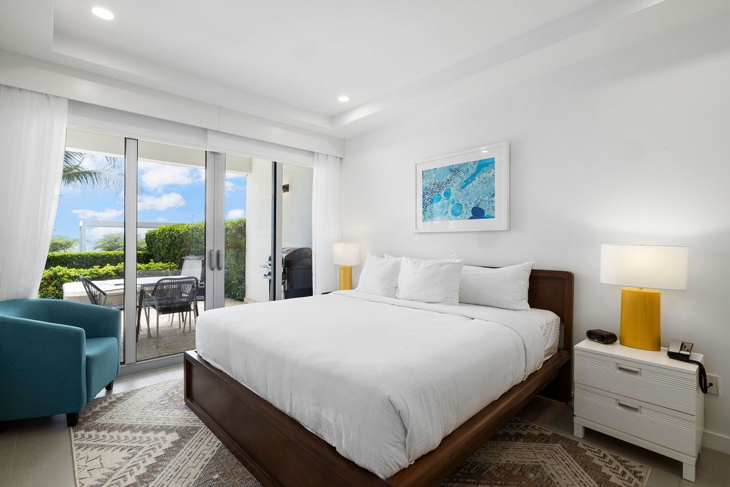 Inside, you'll find one king bed, two full beds, and a sofa that unfolds into a full-size bed, perfect for relaxing after a day of island adventures. The fully equipped kitchen, modern bathrooms with showers, and in-suite washer and dryer provide all the comforts of home. Slide open the doors to step directly onto your patio, where the refreshing Caribbean breeze and beautiful views await.