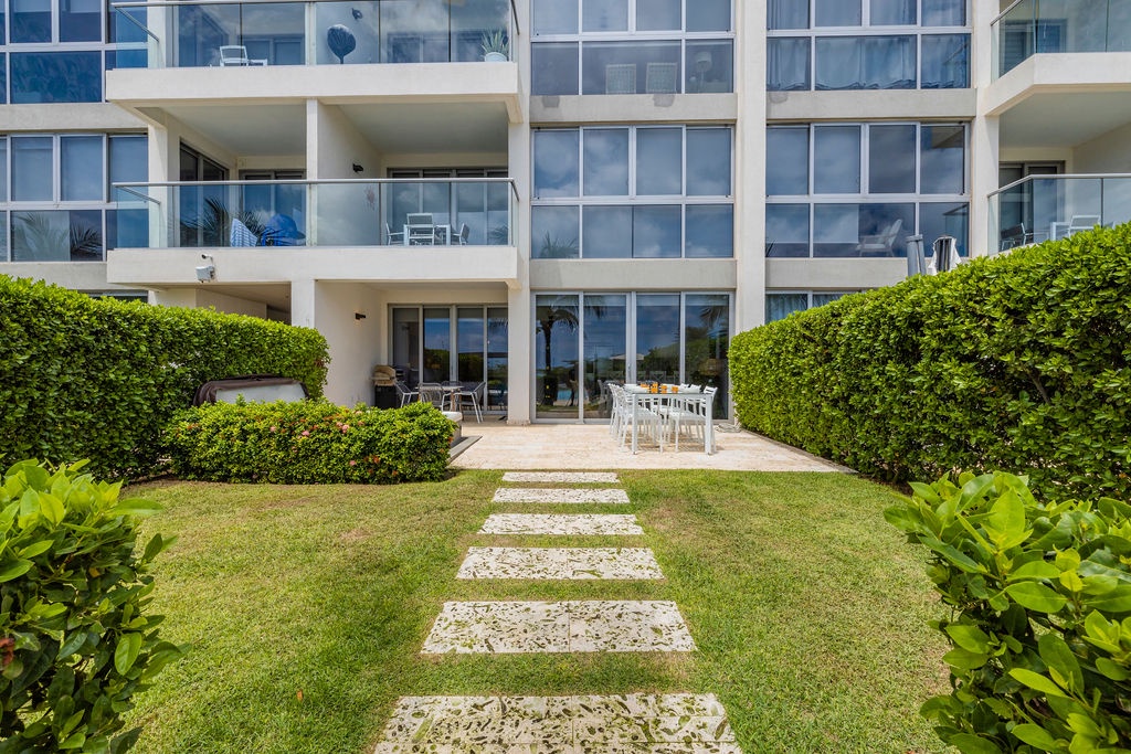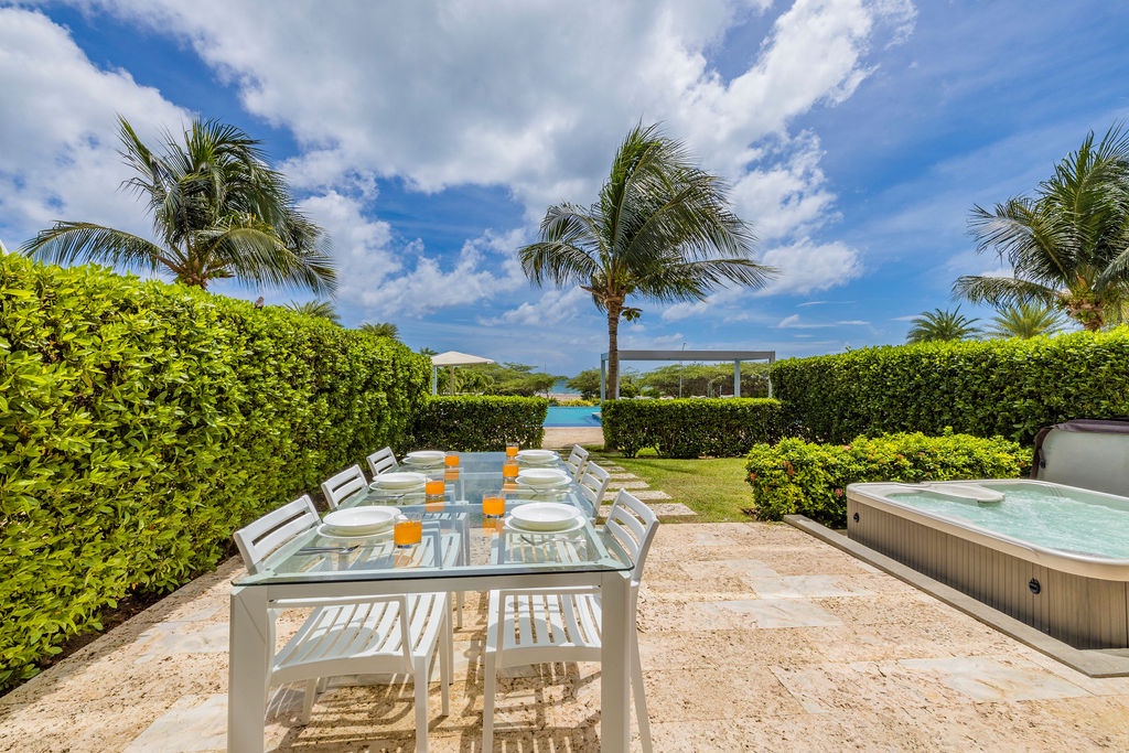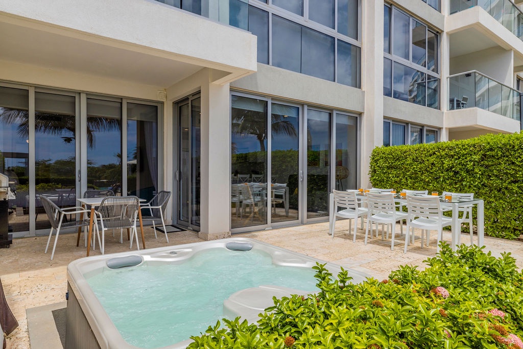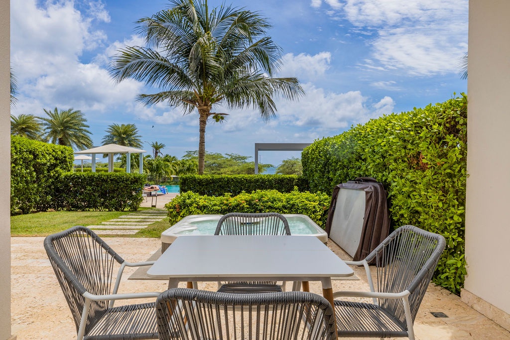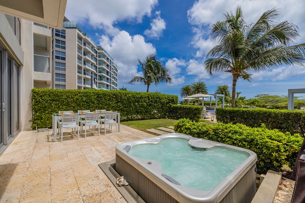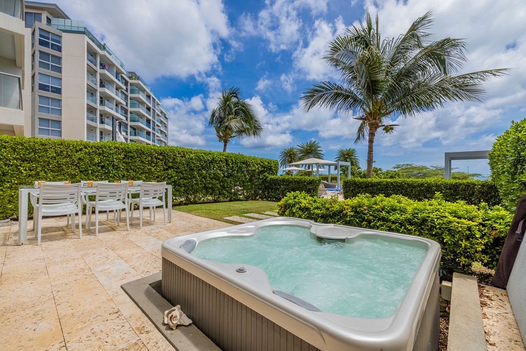 Discover the ultimate tropical retreat in the heart of Aruba at this beautifully furnished condo in the Waves Tower at Azure Beach Residences. Located on the ground floor, this air-conditioned, two-bedroom suite offers the perfect blend of luxury and island vibes. Gaze out over the stunning pool, lush gardens, and the sparkling ocean, all from the comfort of your private patio with a Jacuzzi.