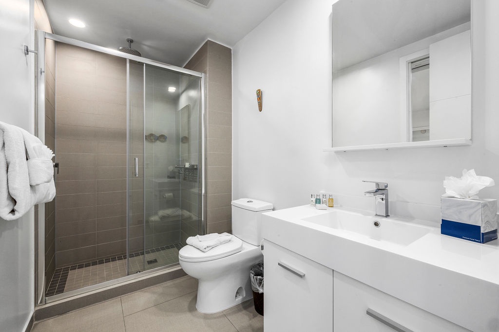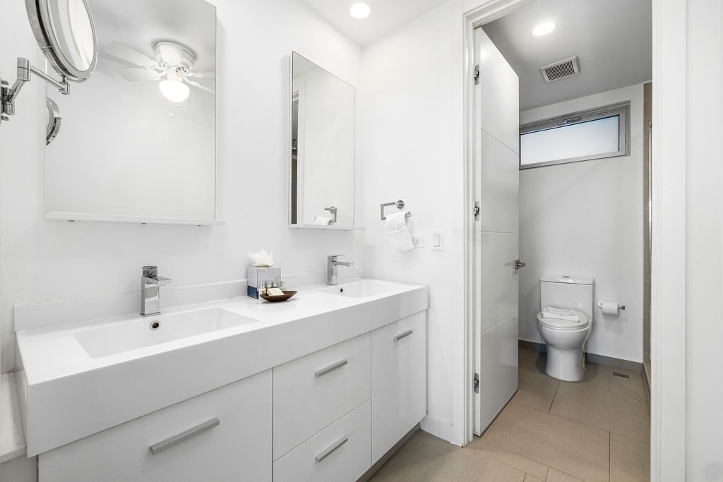 Retreat to the luxurious master bedroom, where a king-size bed with sumptuous linens and a smart TV await. With direct access to the patio, you can step out for a morning dip in the jacuzzi. The ensuite bathroom offers a spa-like experience, featuring a glass-door walk-in shower, soothing rain showerhead, and double vanity sink. The second bathroom is equally well-appointed, with a single vanity, glass-door walk-in shower, and rain showerhead. Indulge in plush towels, premium toiletries, and a hairdryer. For added convenience, a utility room with a stackable washer and dryer is available.