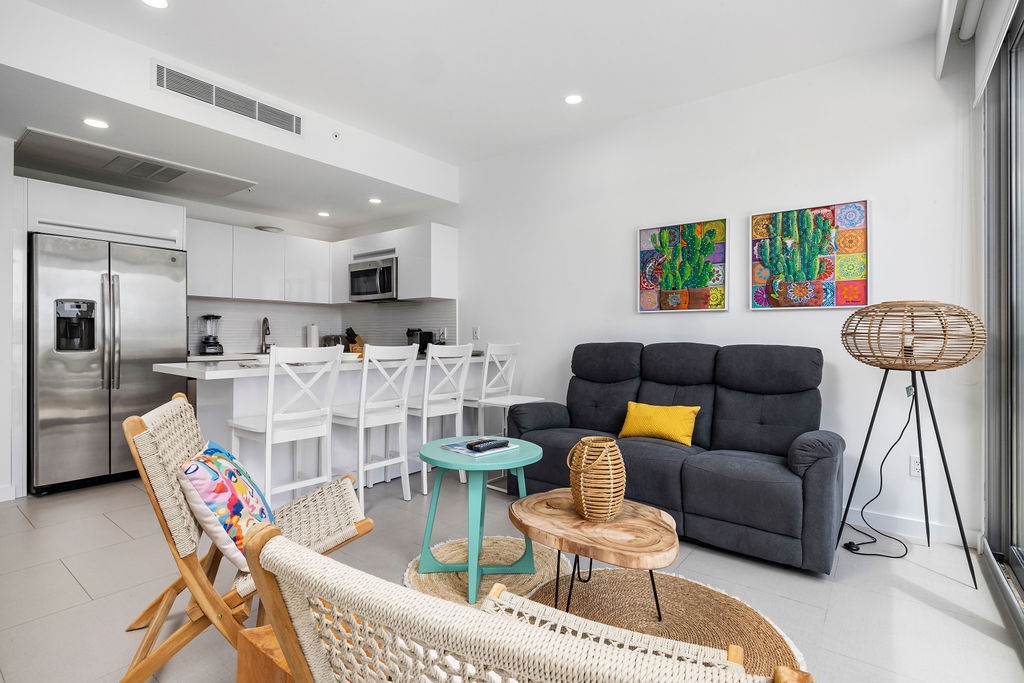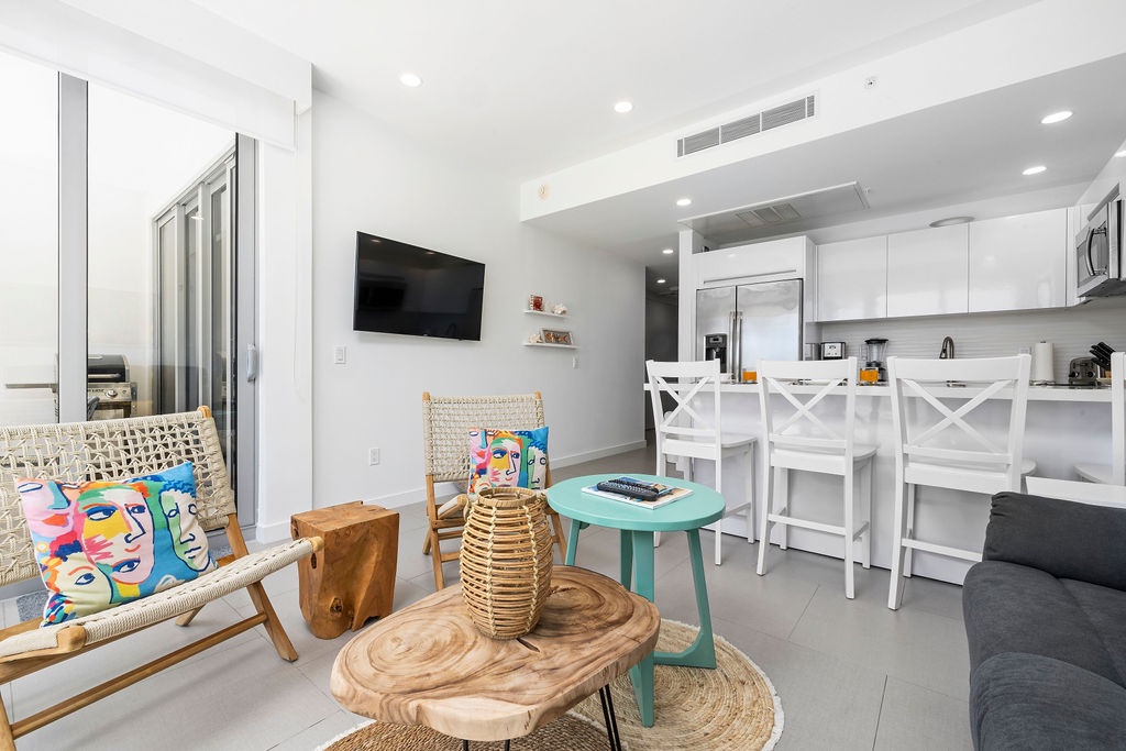 Step into a stylish tropical sanctuary where modern design meets cozy comfort. The living area exudes a tropical beach vibe, featuring elegant teak chairs and a plush sofa that easily transforms into a full-size bed, perfect for unwinding or hosting extra guests. The open-concept layout flows seamlessly into the sleek kitchen, making it a breeze to prepare everything from quick snacks to gourmet meals. Enjoy movie nights in this vibrant space, with sliding glass doors that lead to your private patio, complete with a jacuzzi and access to sparkling community pools.