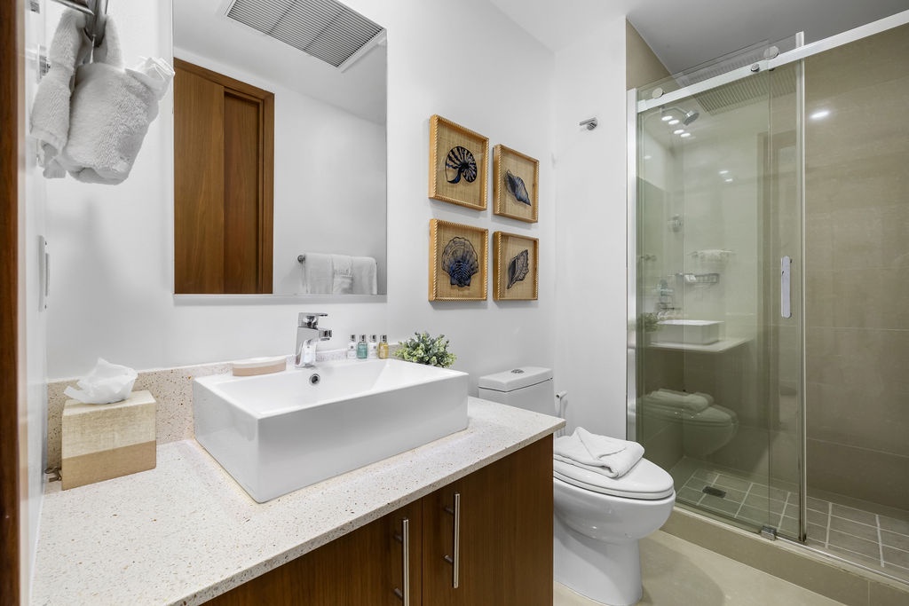 • Each bathroom has their own white towels and blue beach towels in the vanity.